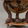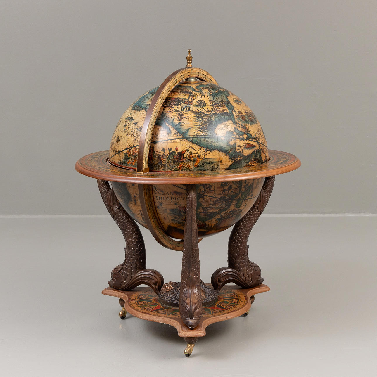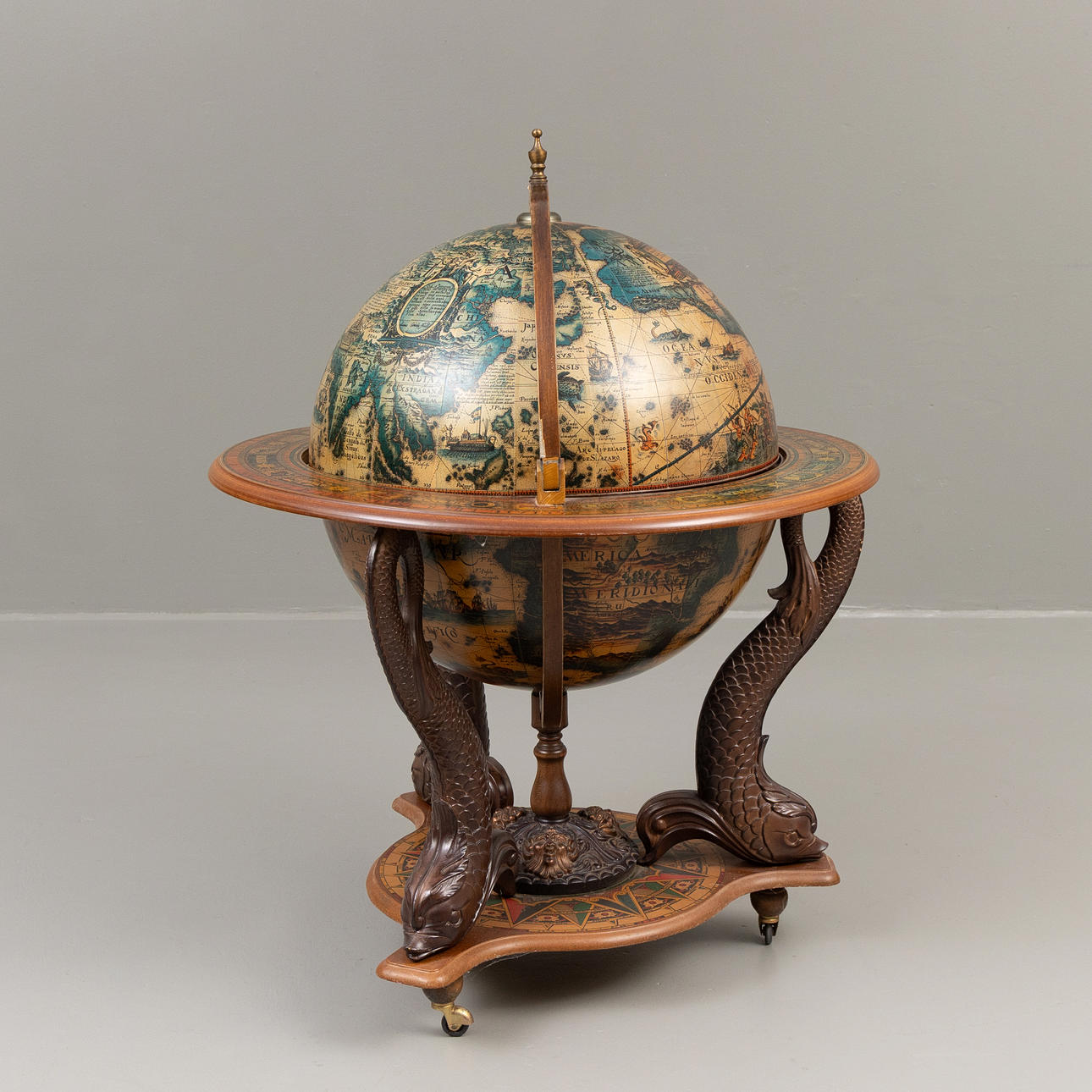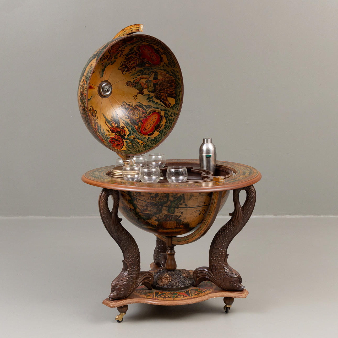 Barskåp i form av en jordglob på ställning i form av fiskar, med hjul, dekor på insida av jordglob, med ishink, mixer och glas, höjd ca 110 cm, Ø ca 84 cm.