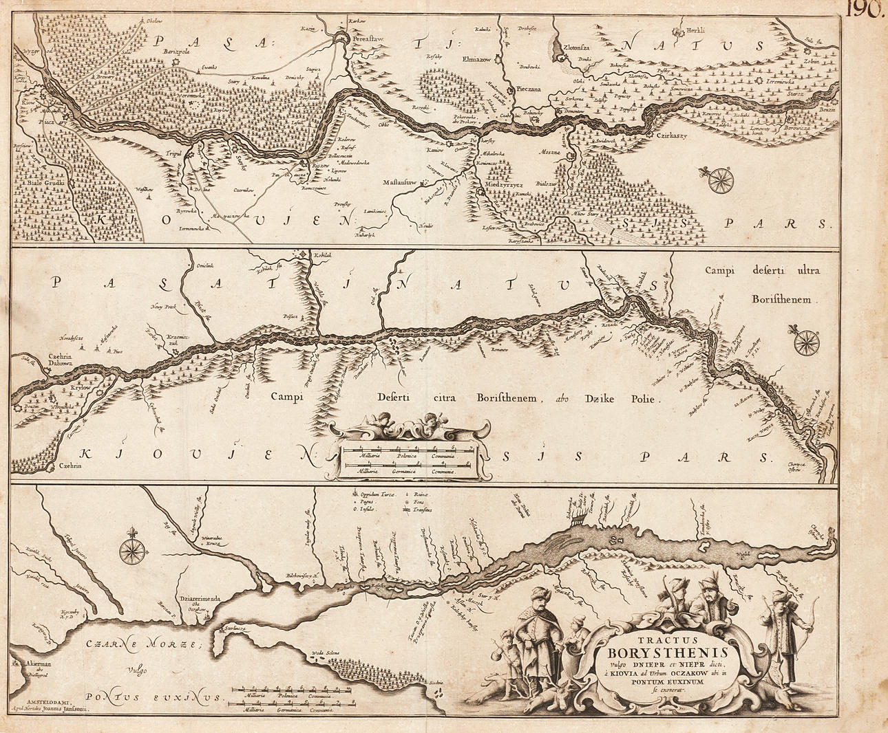 Kartan visar floden Dneprs lopp från Kiev och upp till utloppet i Svarta havet. I nedre högra hörnet en dekorativ kartusch omgiven av pälsklädda jägare med fällda byten vid sina fötter. I mitten en kartusch för skalan och två putti med mätinstrument.