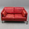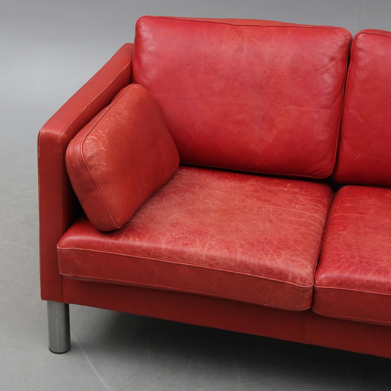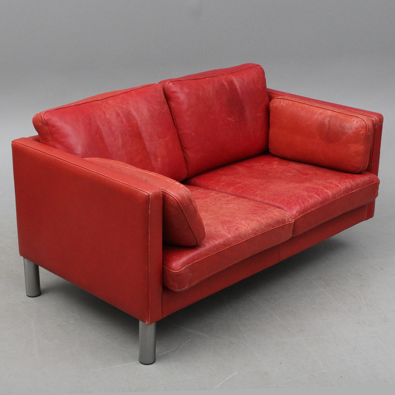 Ett ben är helt löst, men kan åtgärdas. Man kan även nu sitta i soffan när det lösa benet placerats under. Fläckar. Bruksslitage.