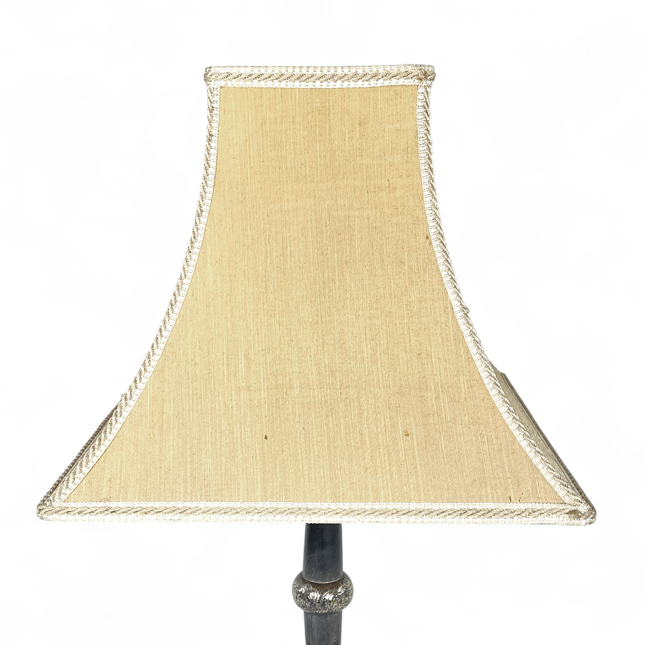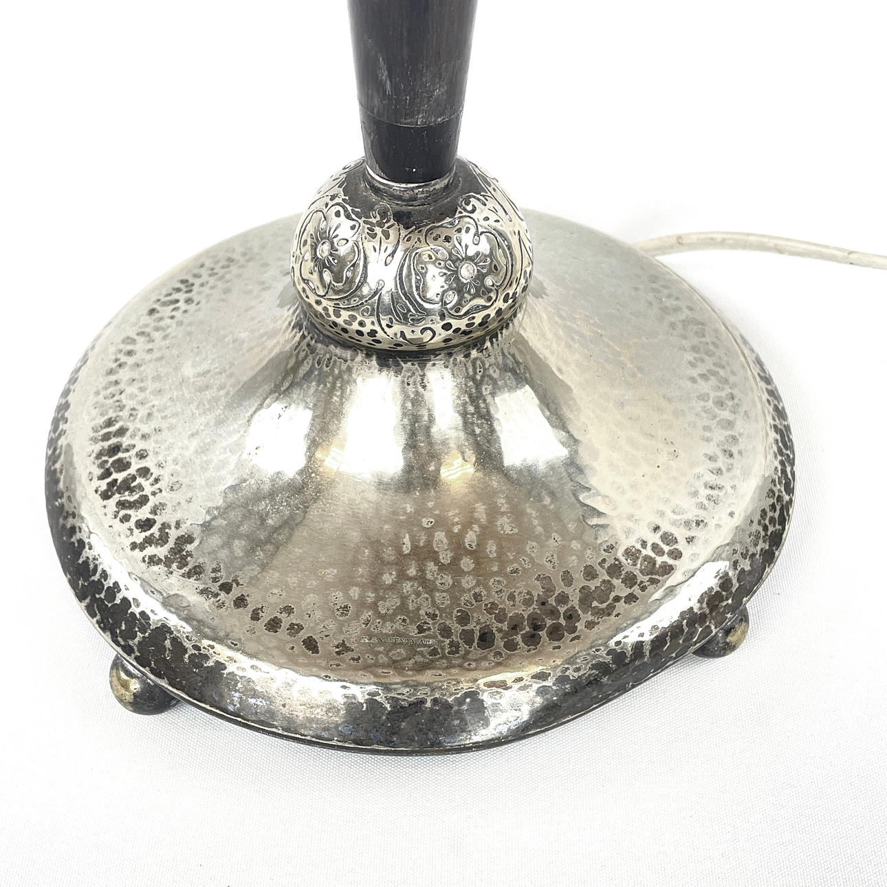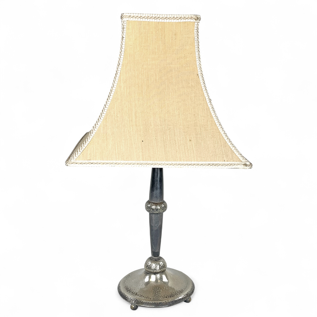Bordslampa med fot i trä och hamrad metall med dekor av blommor. En ljuspunkt. Lampskärm klädd i beige textil.