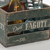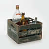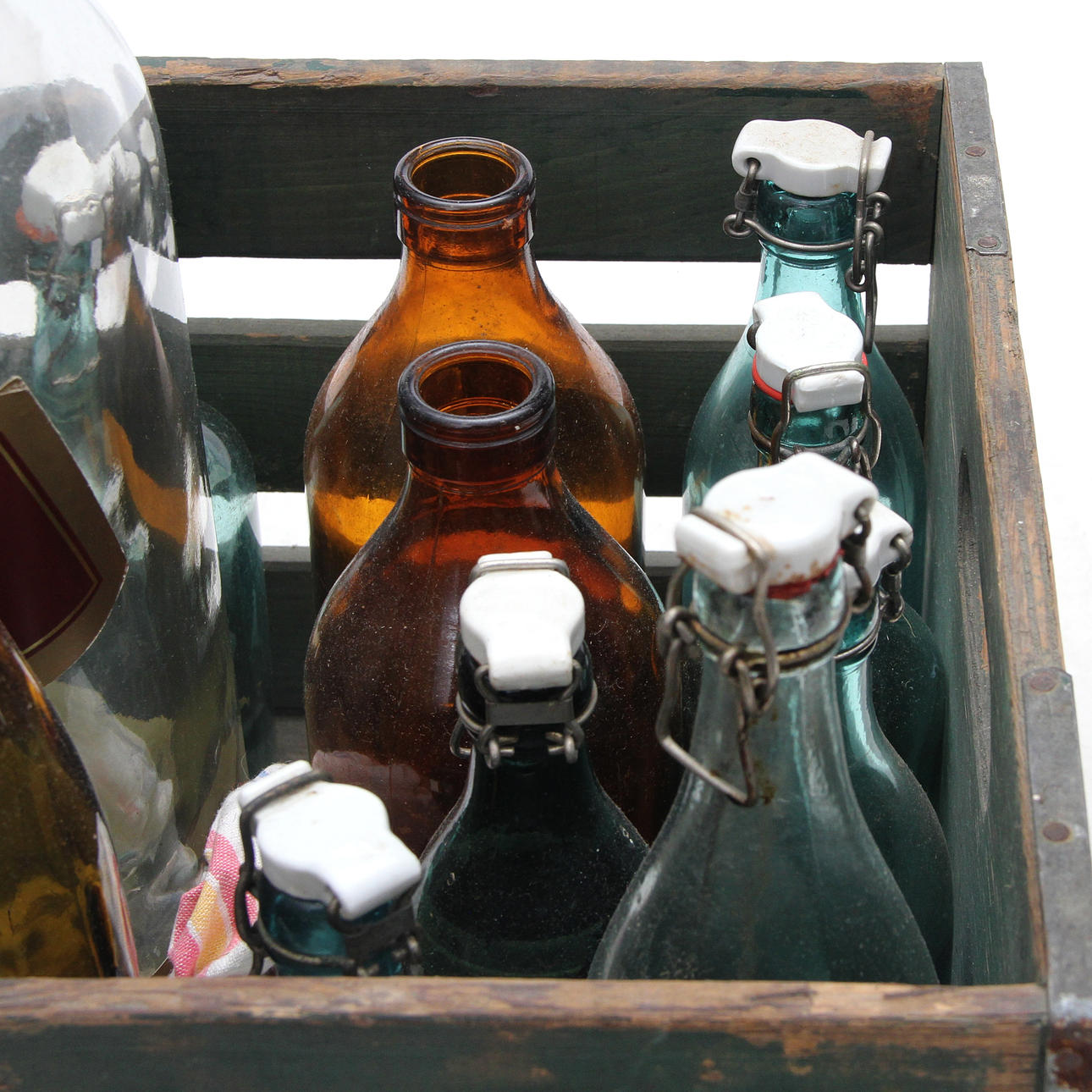 GLASFLASKOR i TRÄBACK. flera med patentkorkar.