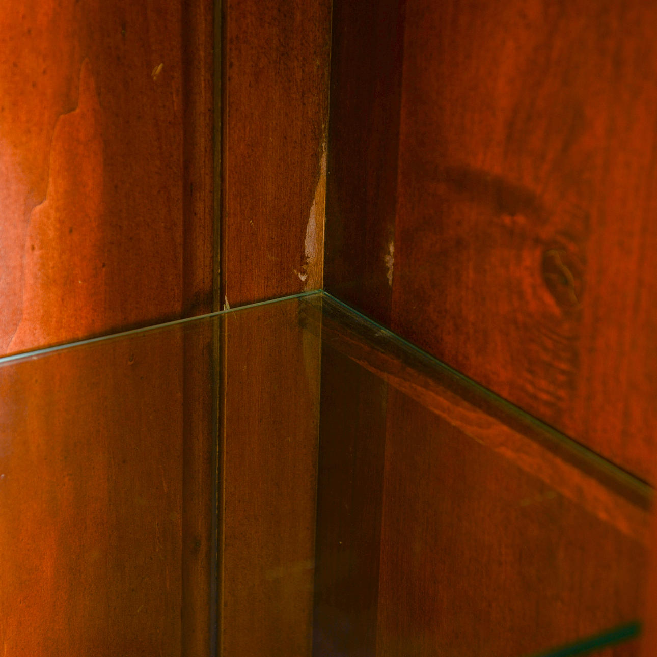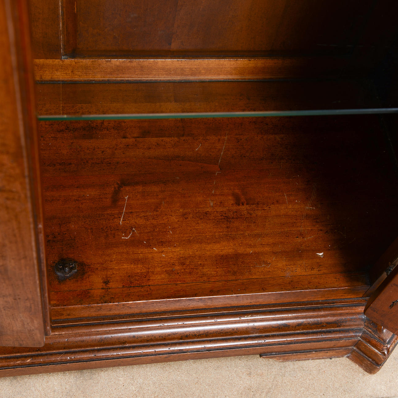 Skrapmärken efter hyllplan på insida. Smärre slagmärken och skador på utsida.