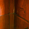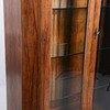 Skåp med hyllplan i glas och pardörrar med slipat glas.