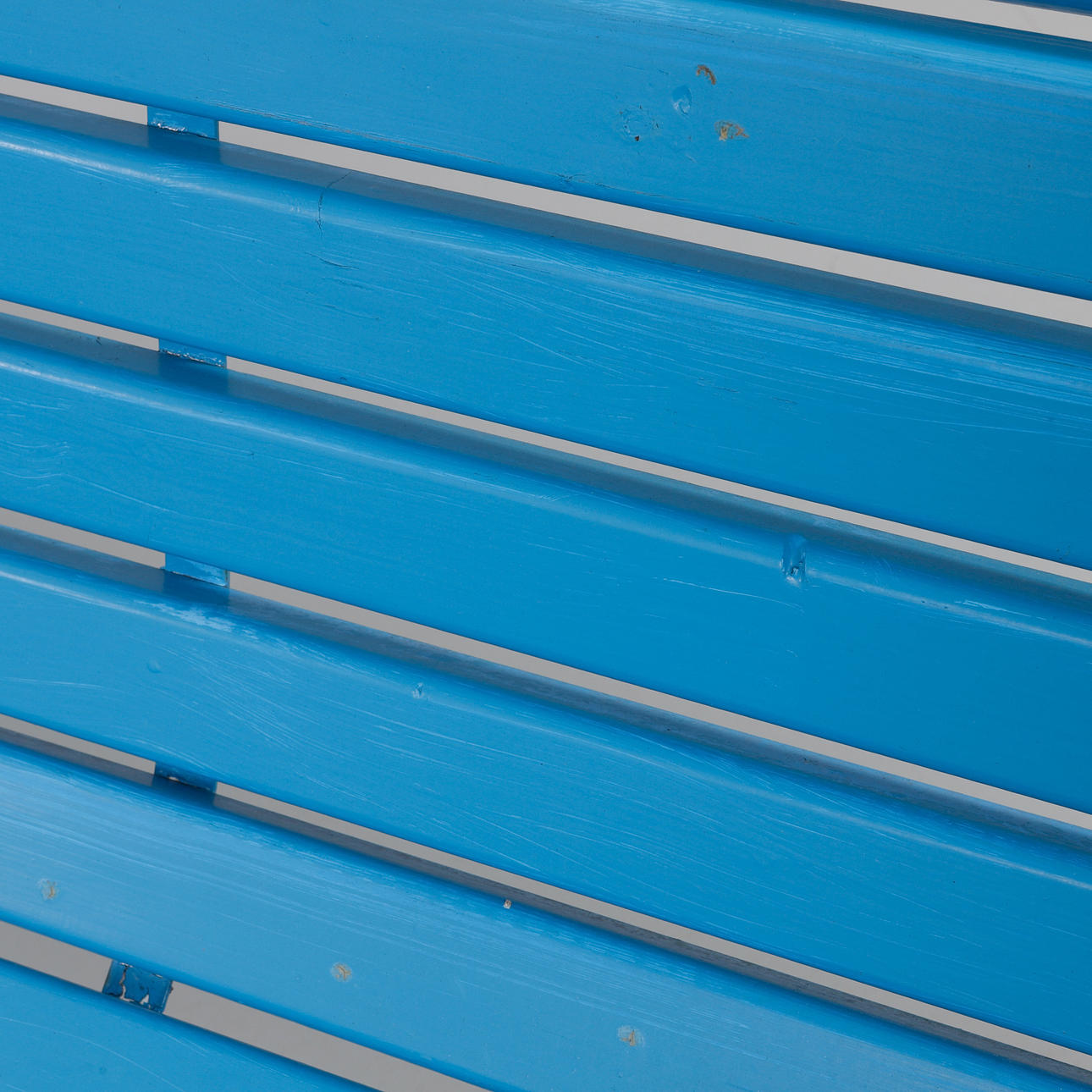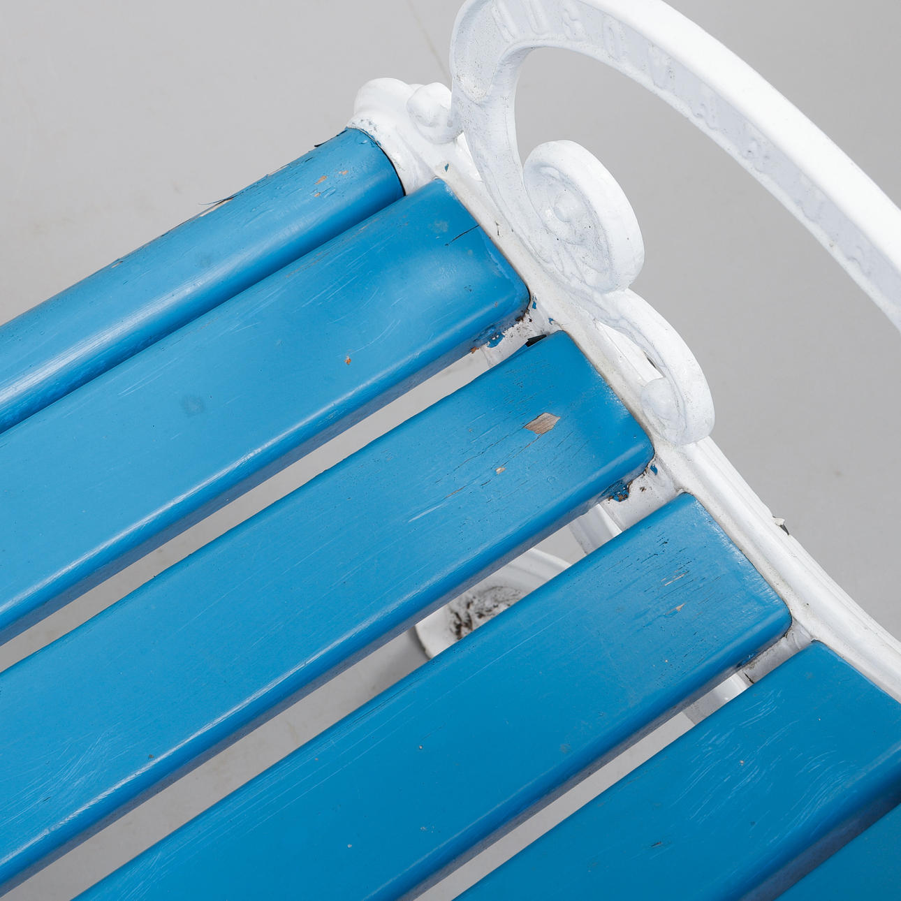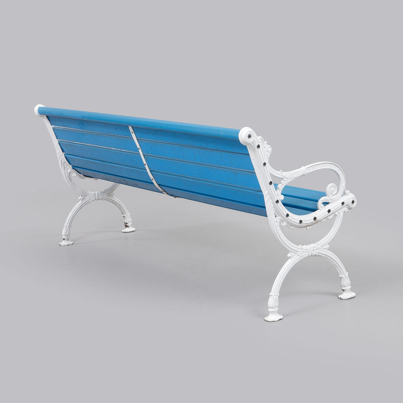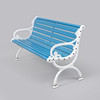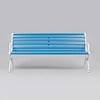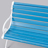 Vitmålade gavlar i aluminium, blåmålade ribbor i sits och rygg. Längd ca 165 cm, sitthöjd ca 42 cm, rygghöjd ca 76 cm.