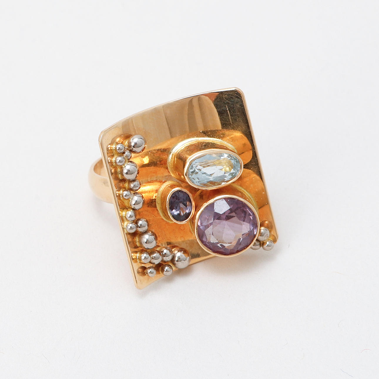 4806460. RING, 18k guld, ametister, akvamarin, Ada, Göteborg, vikt ca 18,8 gram.
