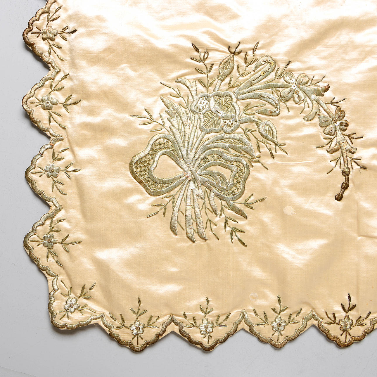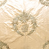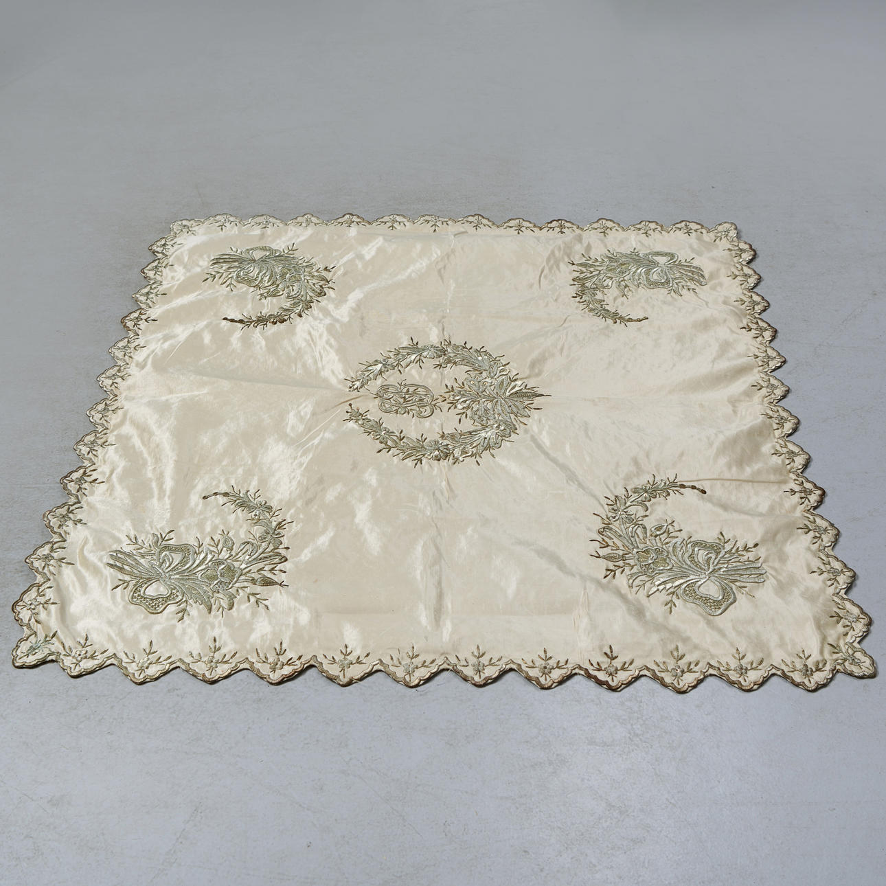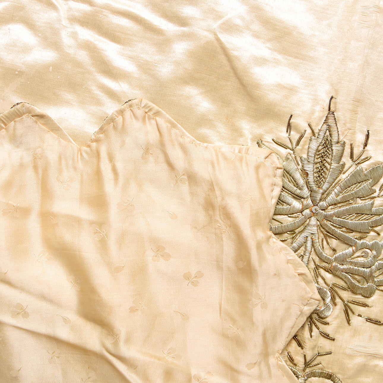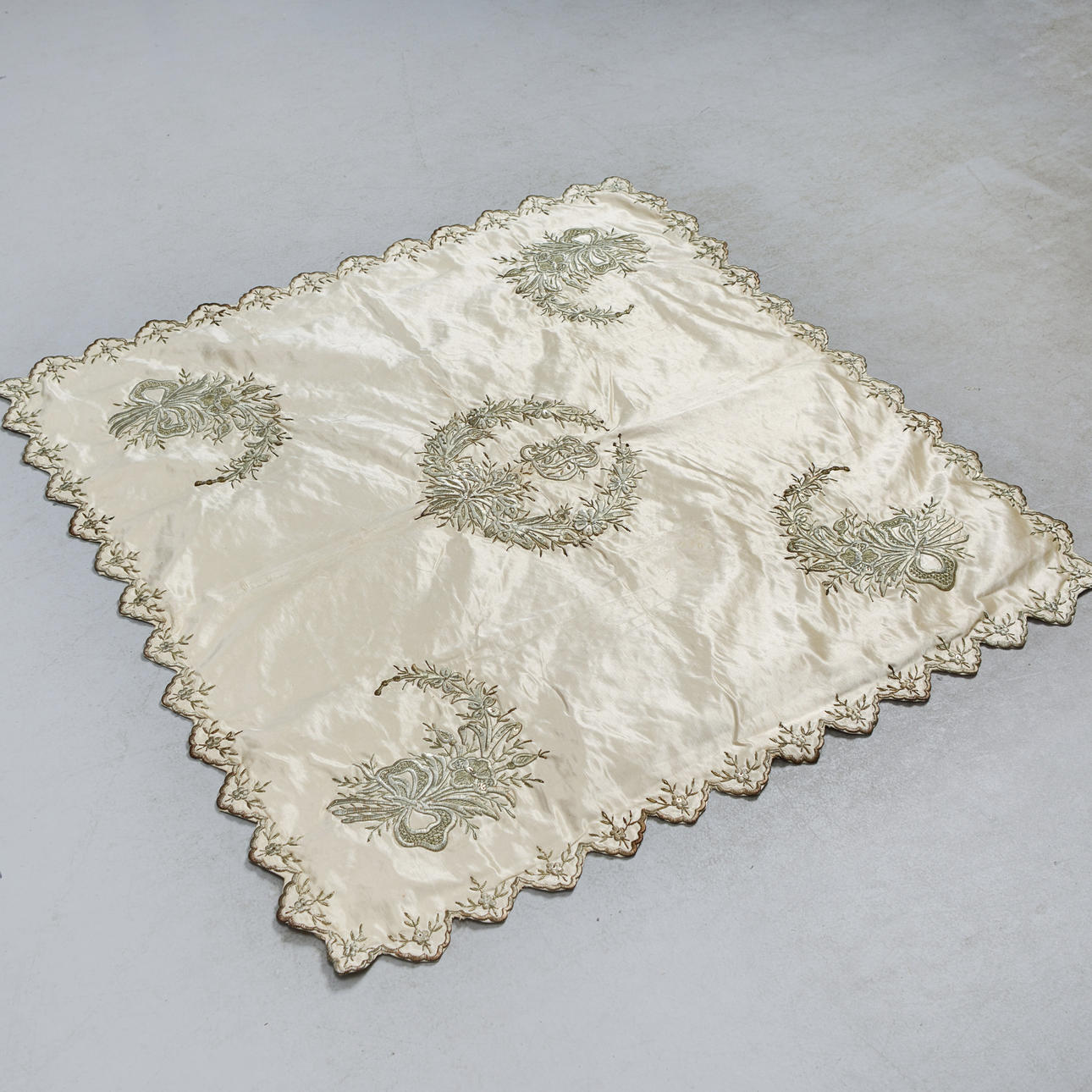 Bröllopsduk i cremefärgat siden samt brodyr i metalltråd med stenar. Mittenmedaljong med monogram. Fodrad baksida.