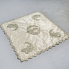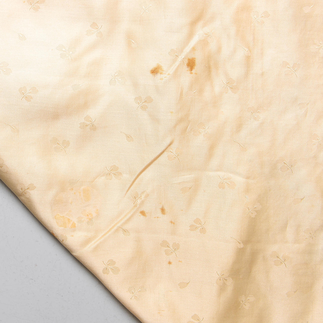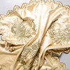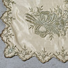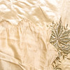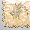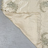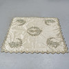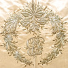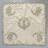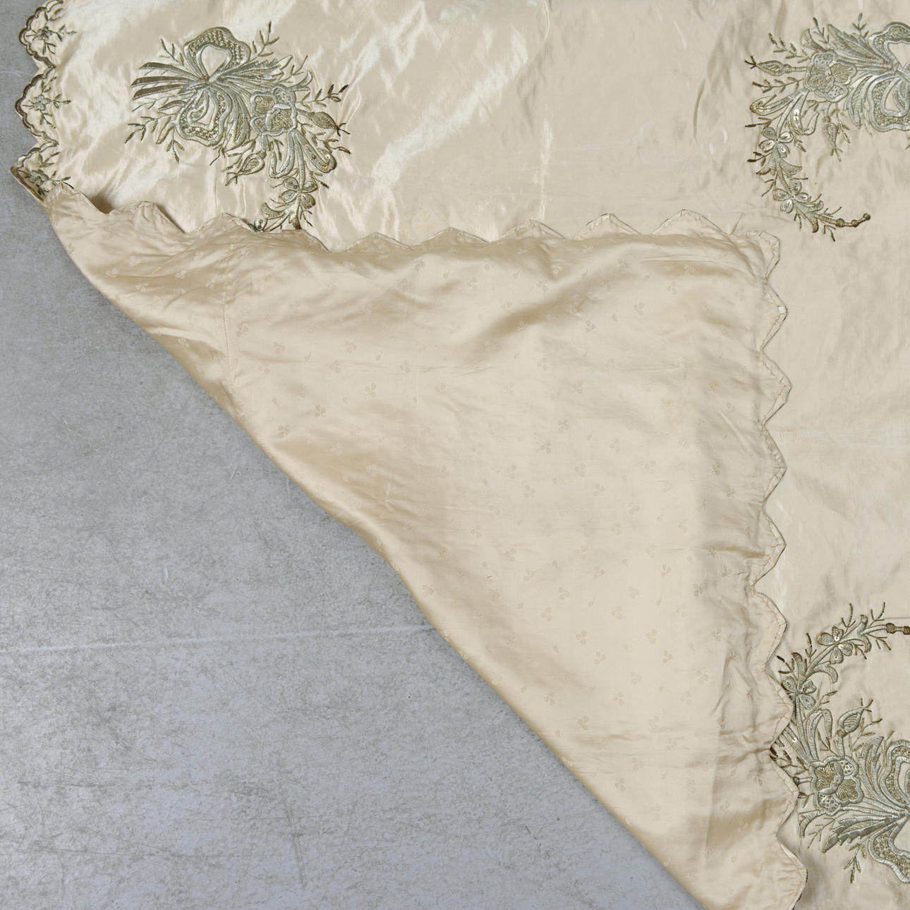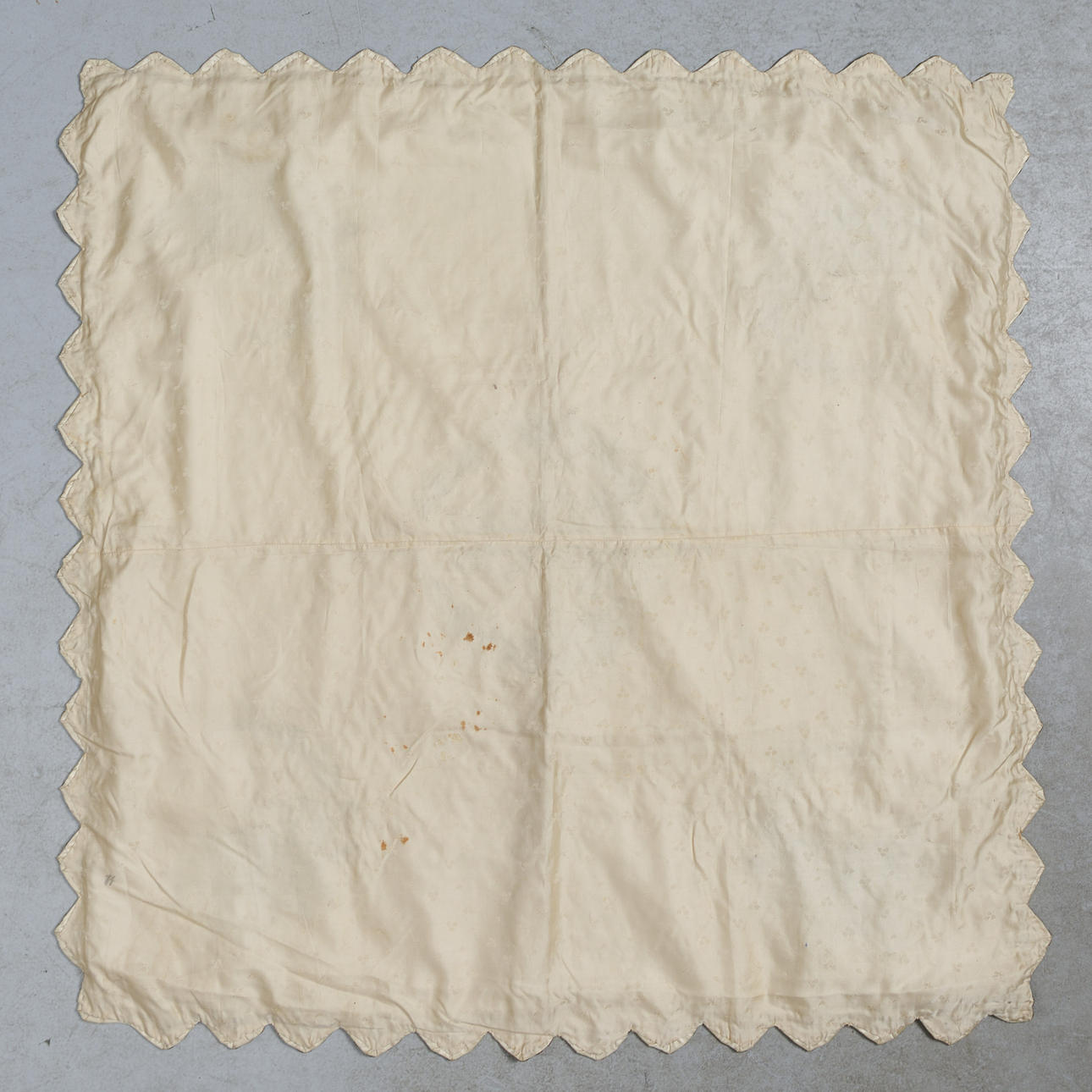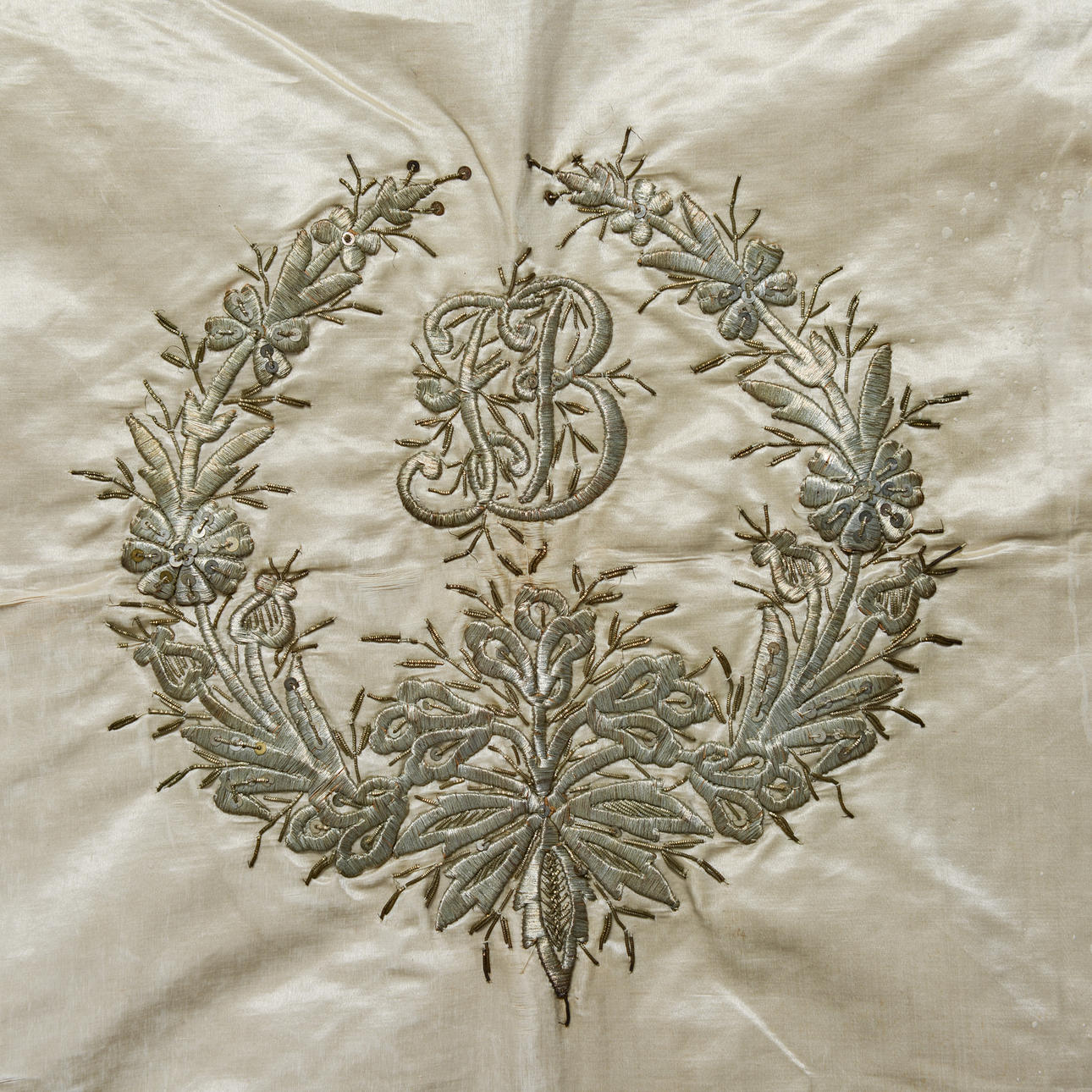 Bröllopsduk i cremefärgat siden samt brodyr i metalltråd med stenar. Mittenmedaljong med monogram. Fodrad baksida.