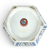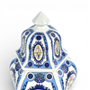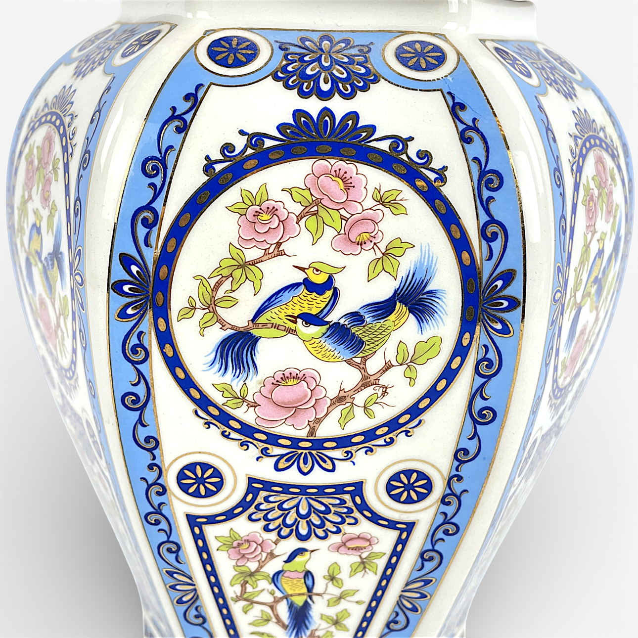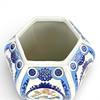 Lockurna i hexagonal form, med dekor av bl a fåglar, höjd inkl lock ca 34 cm, Ø ca 19 cm.