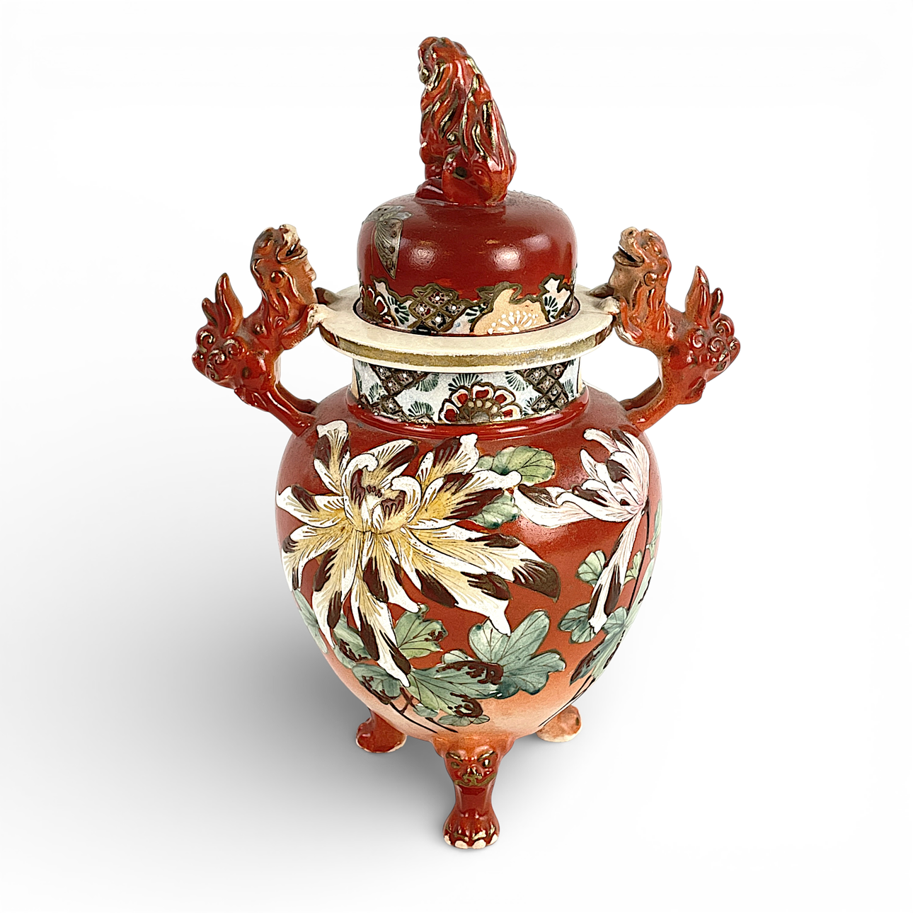 Lockurna med hänklar, på tre ben, lockknopp i form av foo-hund, dekor av blommor.
