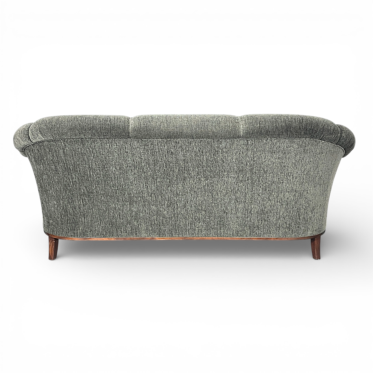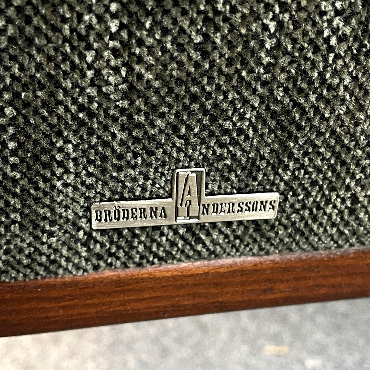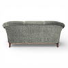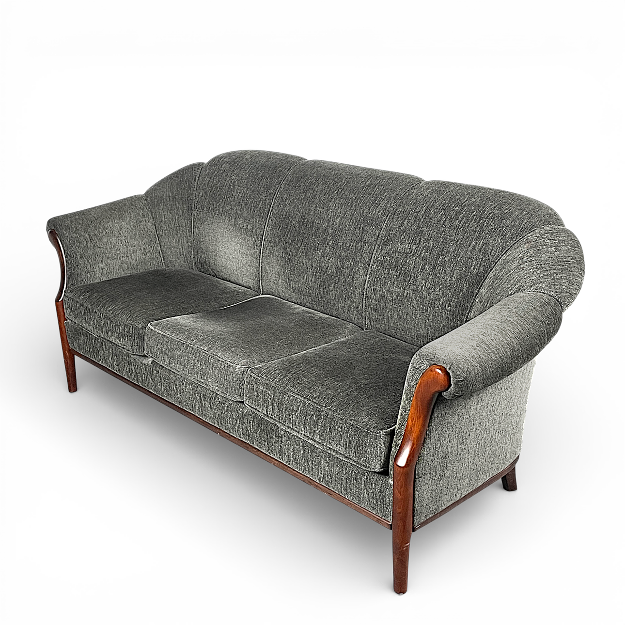 Stomme i betsat trä. Fast stoppad snäckslasformad rygg, lösa plymåer i sits. Klädsel i grå textil. Brickmärkt "Bröderna Andersson".
