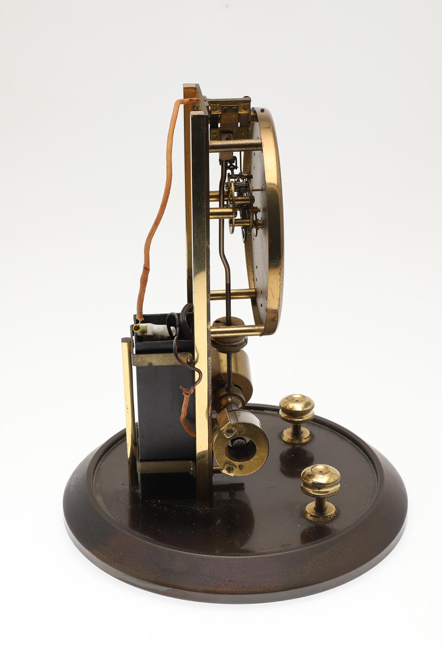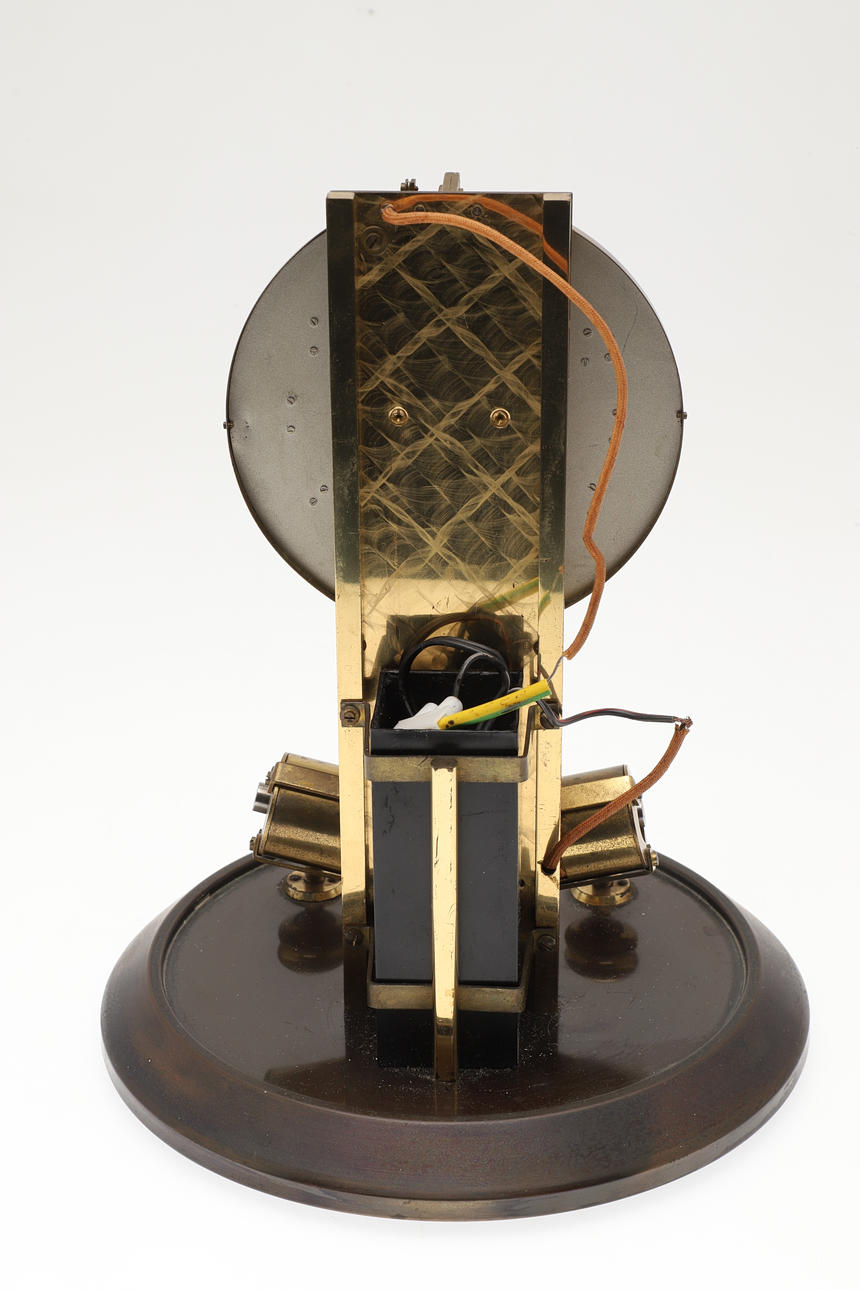Klockan med Försilvrad urtavla och guldfärgade siffror, med en elektrisk mekanism och monterad på en metallbas. Med en glaskupol, 26 cm hög inklusive bas, kupol 25 cm hög (27 cm hög totalt med kupol).