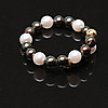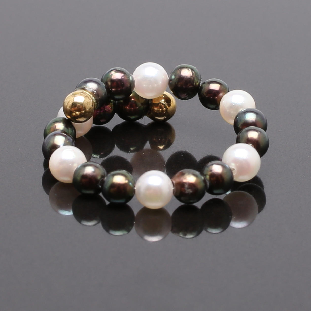 Odlade pärlor, pärlor av hematit (blodsten) samt avslutande guldpärla uppträdda på tråd.
