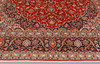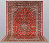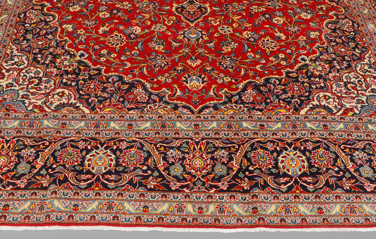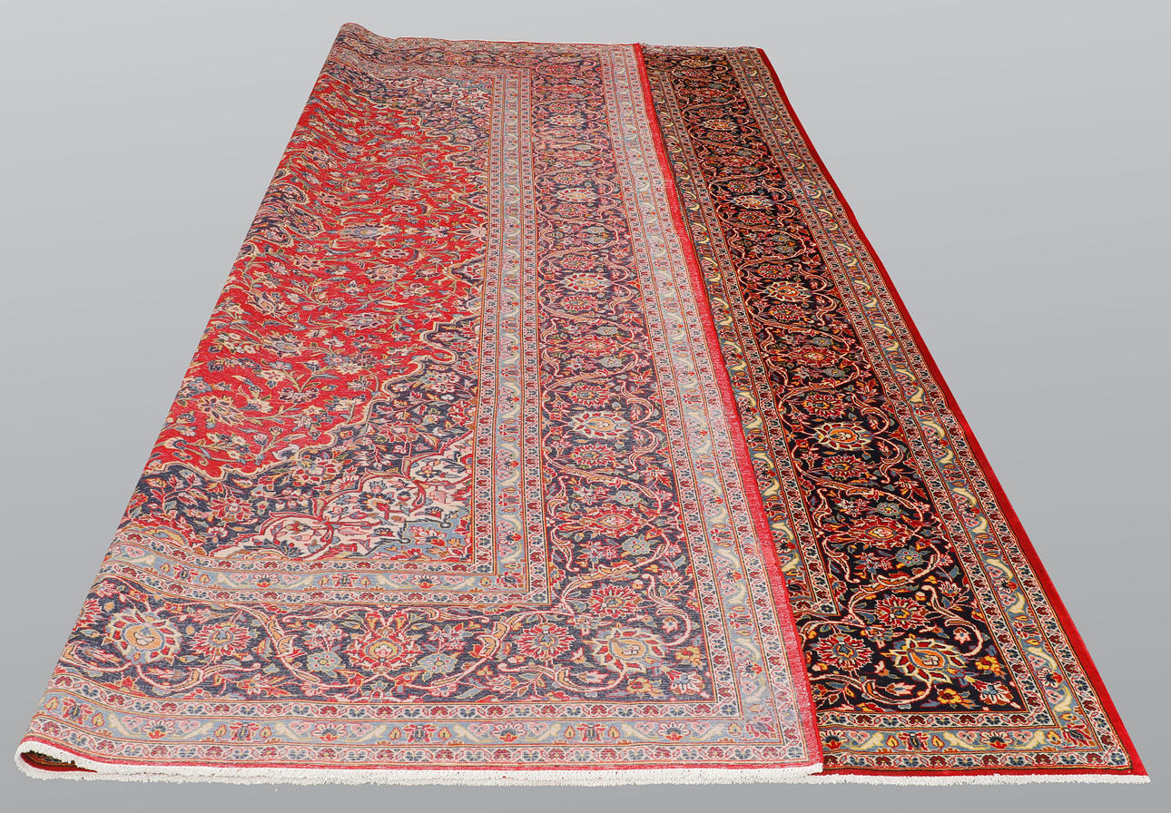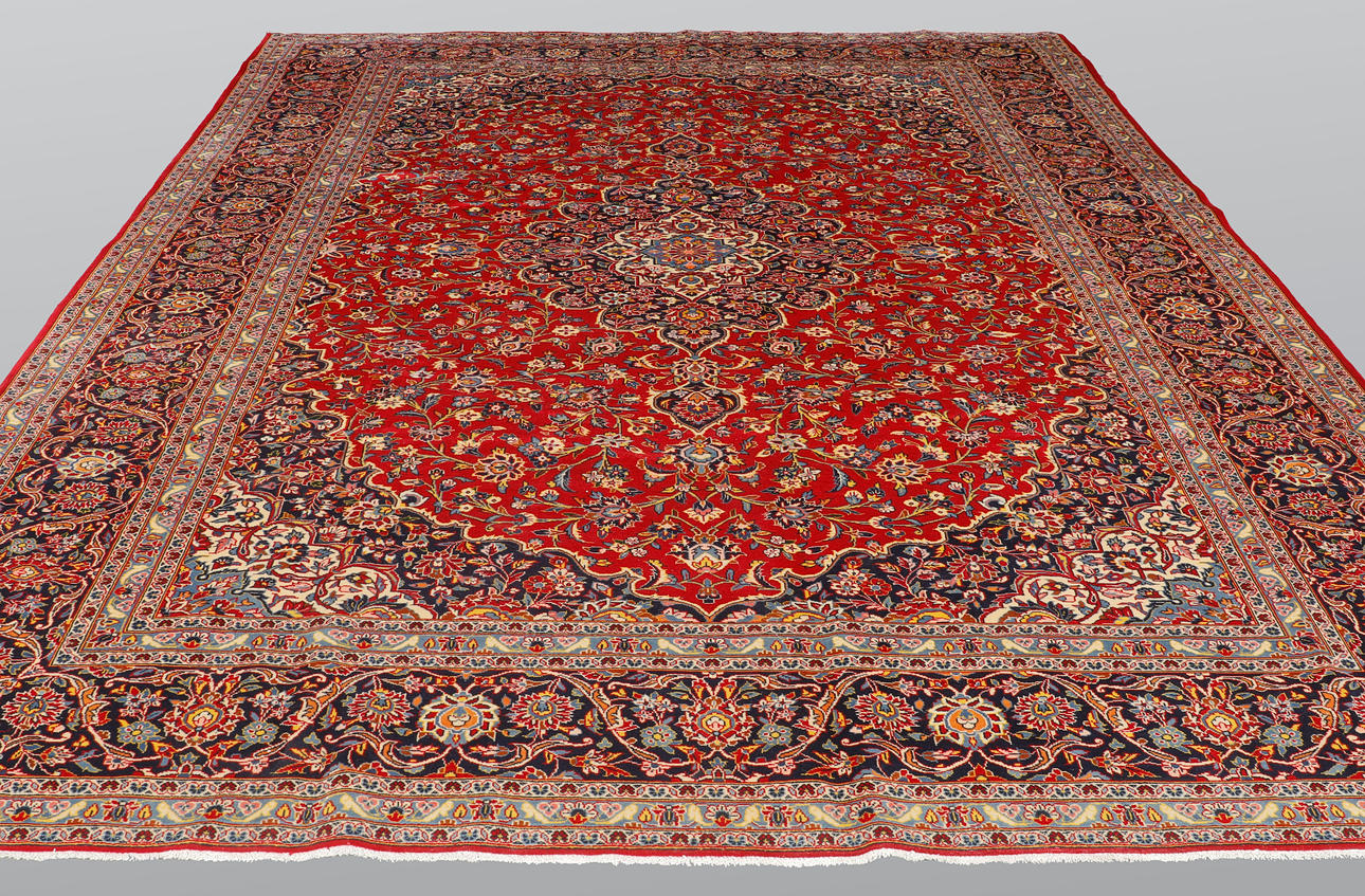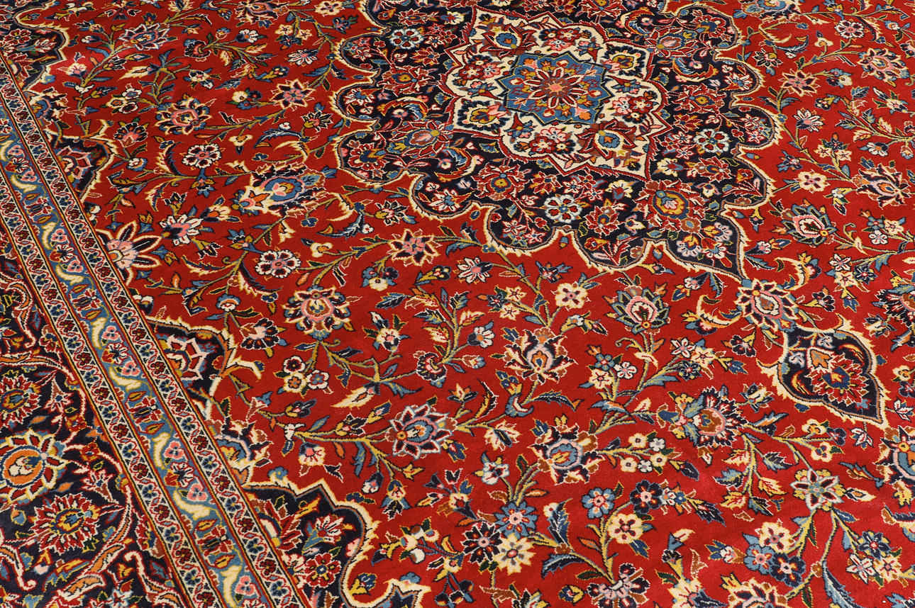 Keshan med röd bottenfärg och en centralt placerad medaljong med detaljer i blått, beige och grönt. Mittfältet är täckt av floralornamentik, palmetter och arabesker i liknande nyanser, och hörnpartierna följer samma mönsterstruktur. Bården har en mörk botten och dekor av palmettrankor. Luggen är av ull och varpen är av bomull.