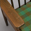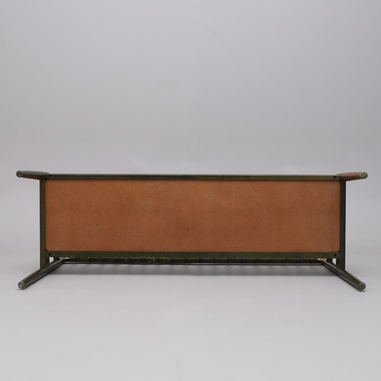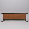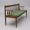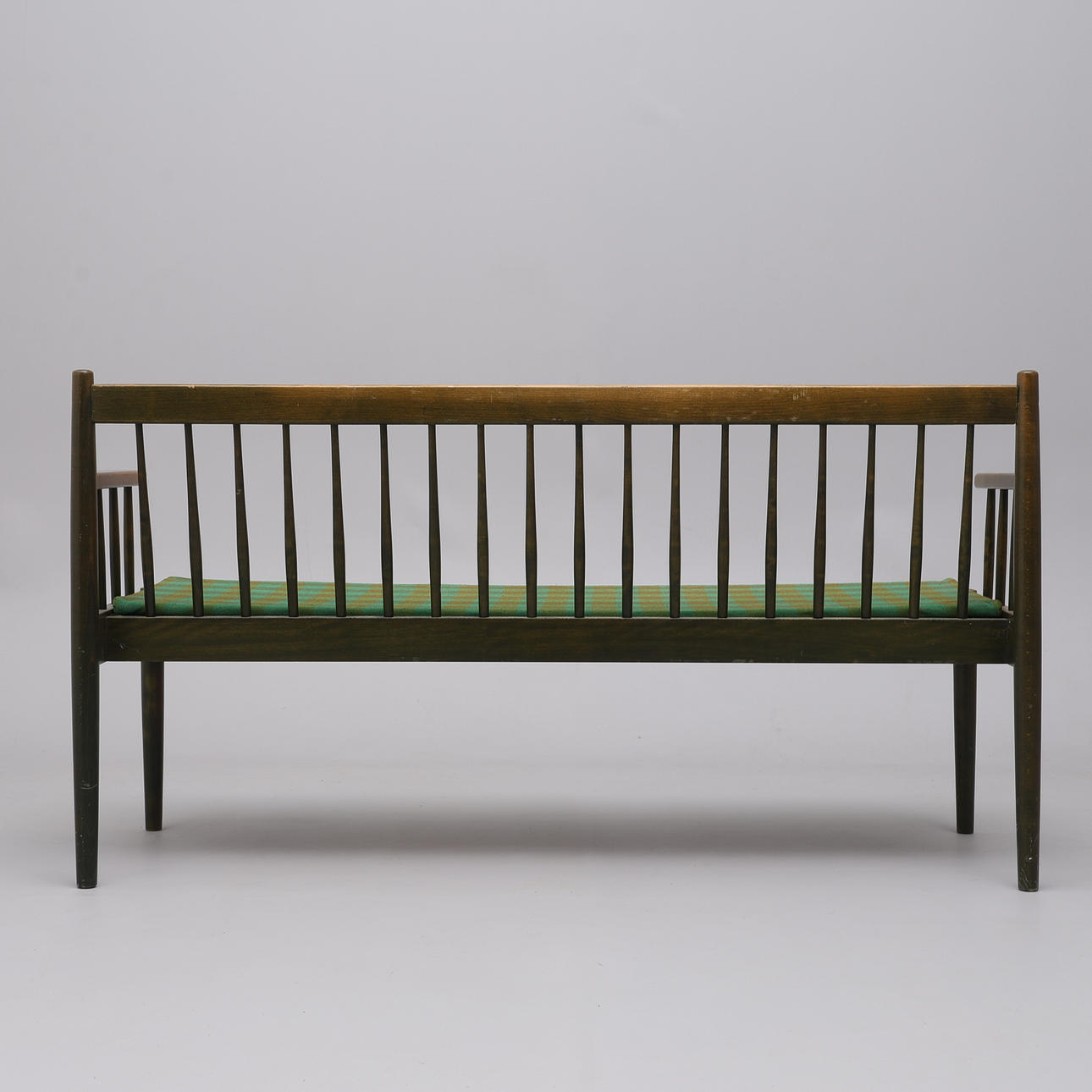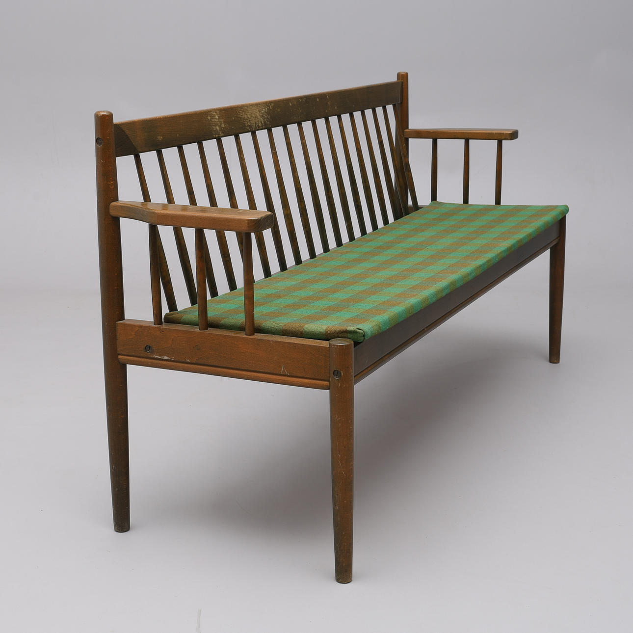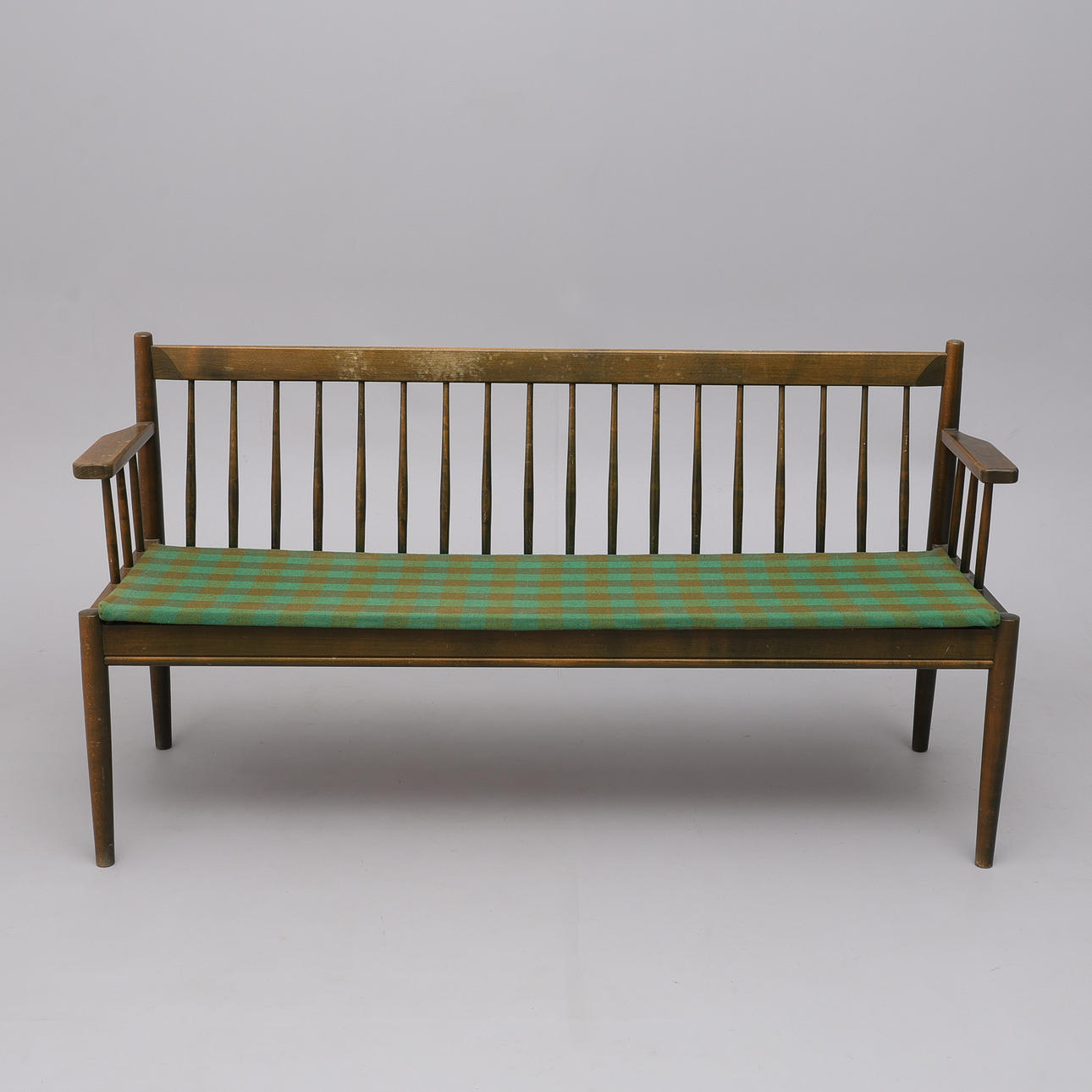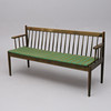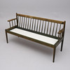 Bemålat trä, textilklädd sits med förvaring under. Längd 147 cm, djup ca 50 cm. Rygghöjd 80 cm, sitthöjd 44 cm.