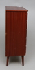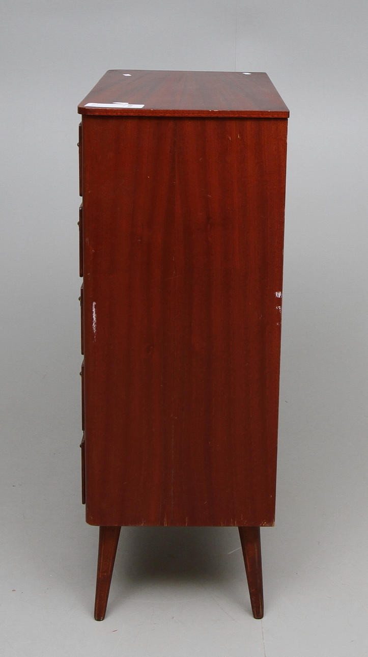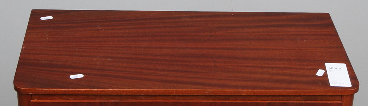 Fanerad i mahogny, fem lådor, handtag av mässing. Längd 64, bredd 32, höjd 89 cm.