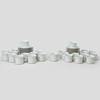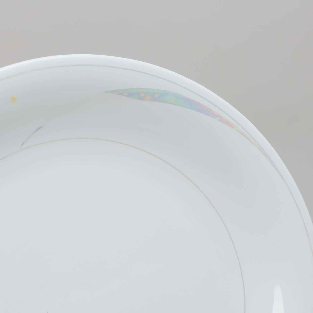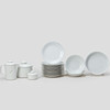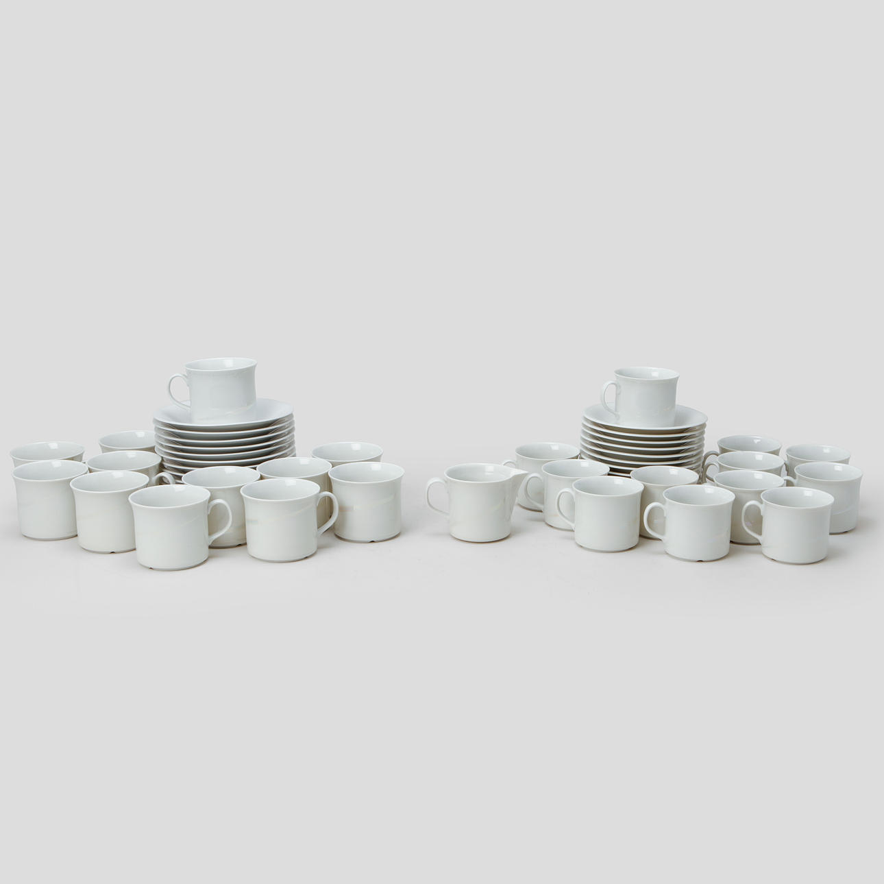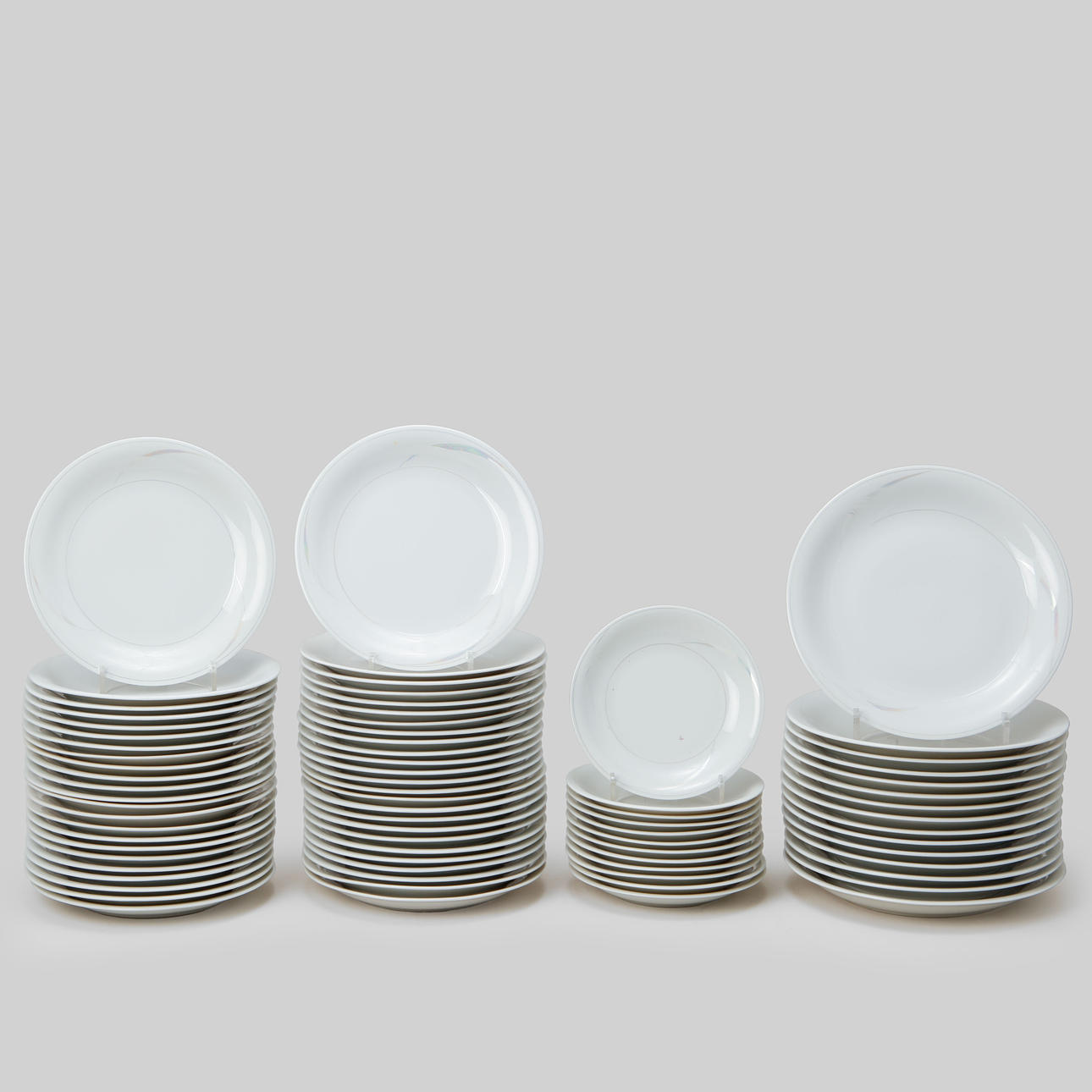 28 mattallrikar, 48 förrätt, 12 koppar med fat, 12 koppar med fat, 12 assietter, 2 djupa tallrikar, 1 lockkarott, 1 form, 1 kanna, 1 sockerskål, 1 gräddkanna.