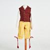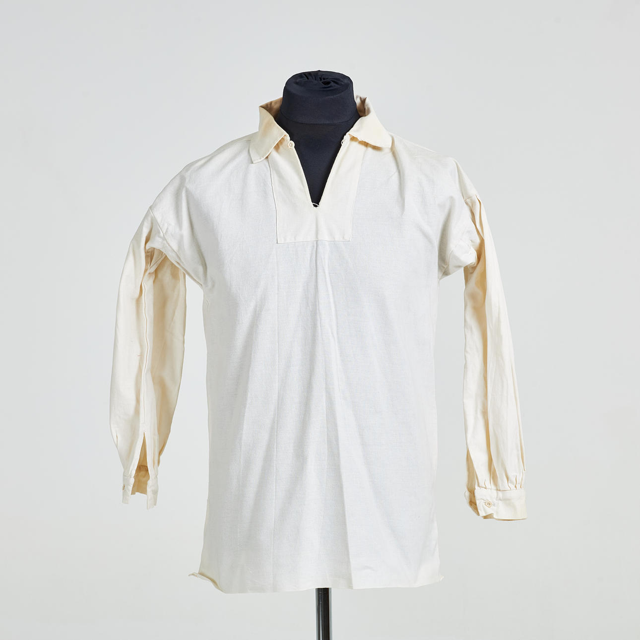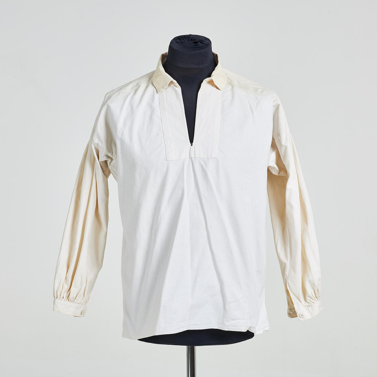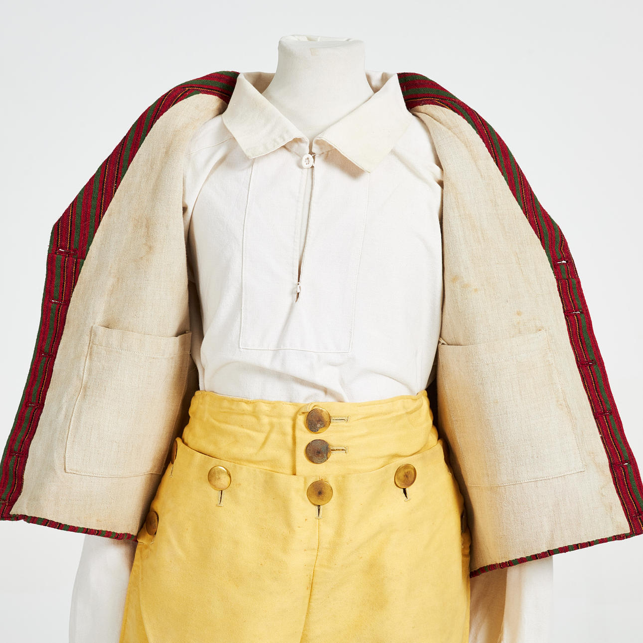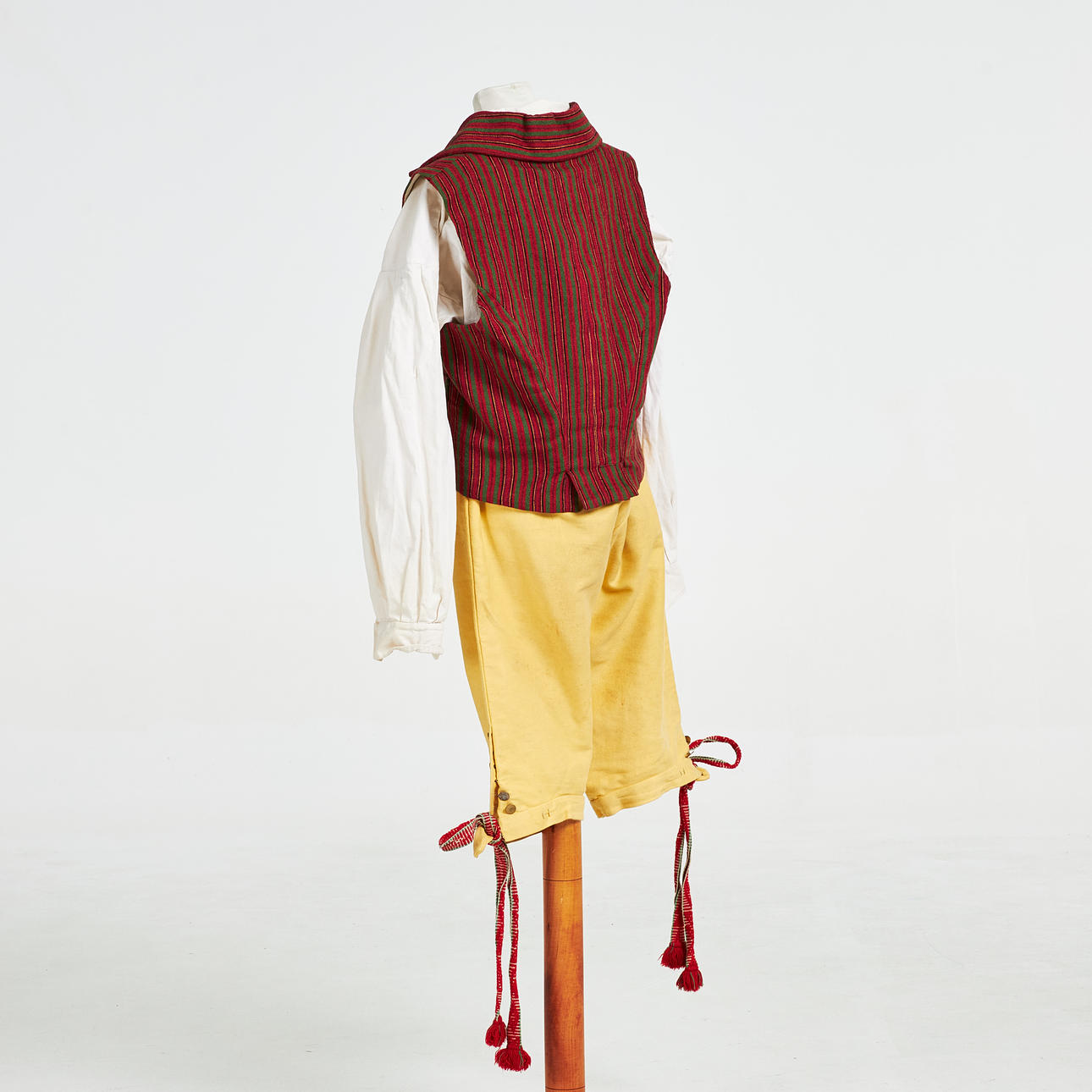 Mått ca; skjortor längd rygg ca 71, bredd axel-axel ca 55 samt 60, 60, väst längd 53 midja 86, byxa midjemått ca 86 ben längd ca 68.