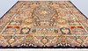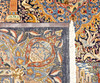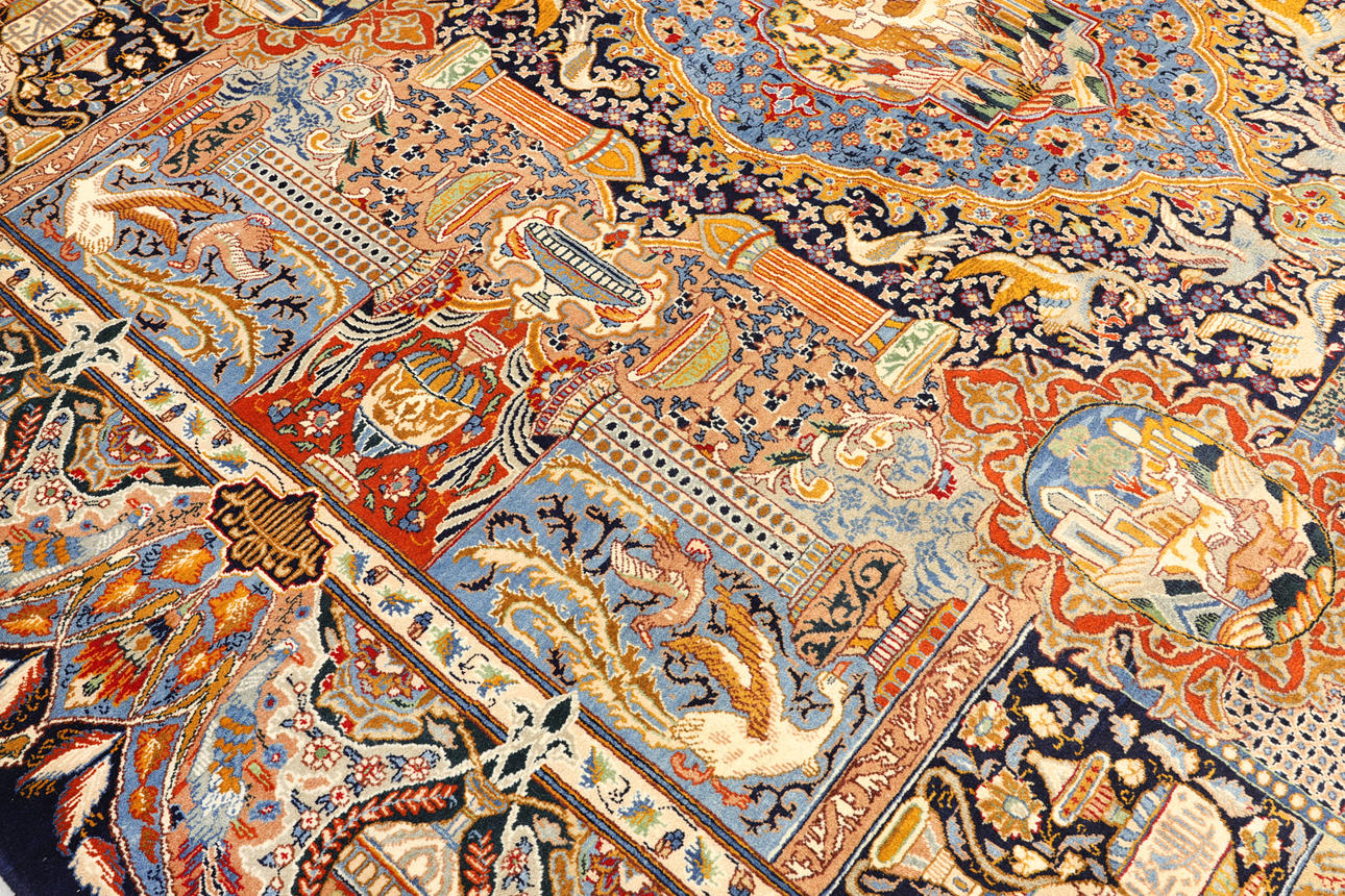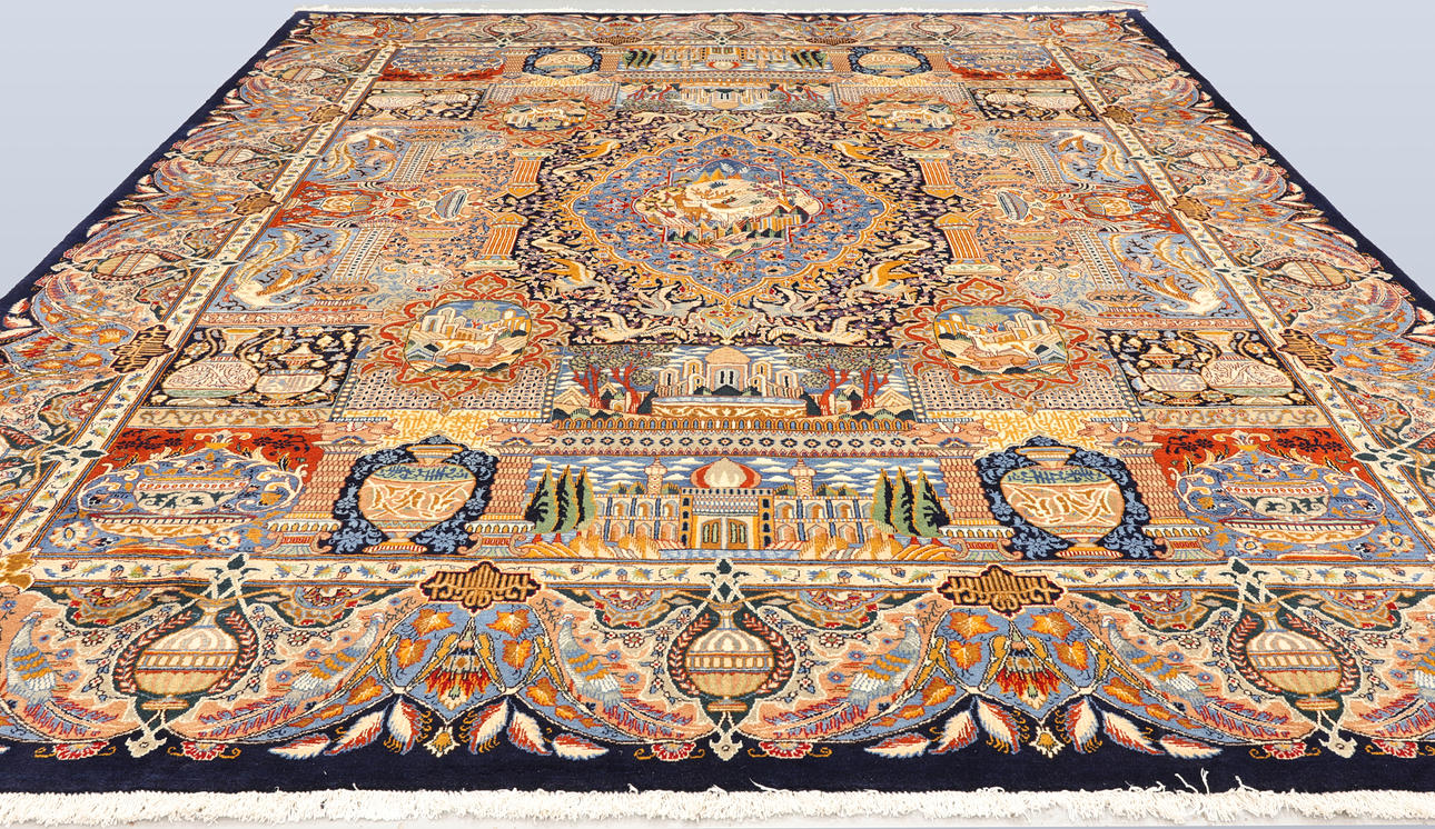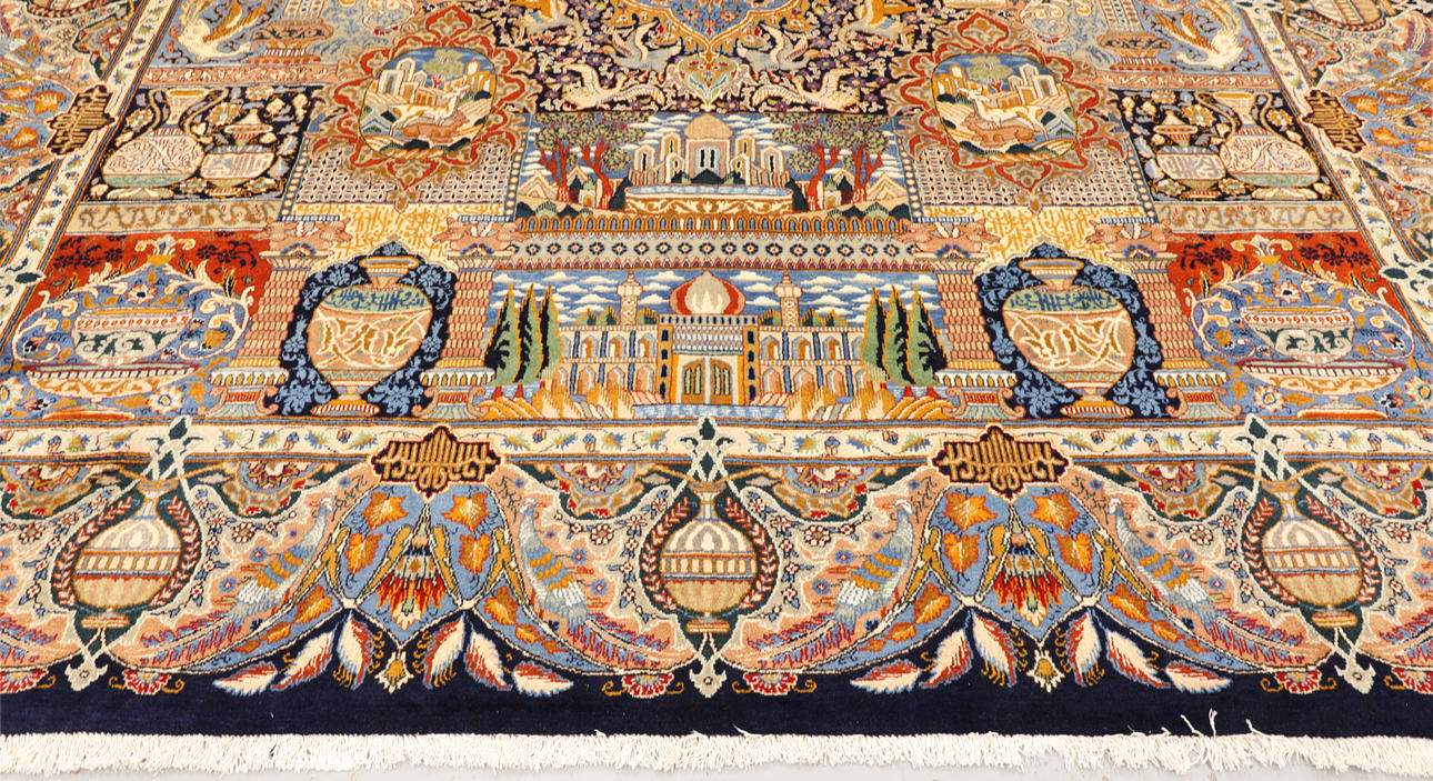 Figural Kashmar fine med mörk bottenfärg och ett rikt bildfält uppdelat i arkitektoniska och figurativa motiv, där landskap, byggnader, urnor, djur och ornamentala detaljer samspelar. Mittfältet domineras av en medaljong med figurmotiv, omgiven av palmetter, arabesker och blomrankor. Bården är uppbyggd av ytterligare floral dekor och vaser på en mörk botten. Luggen är av ull och varpen är av bomull.