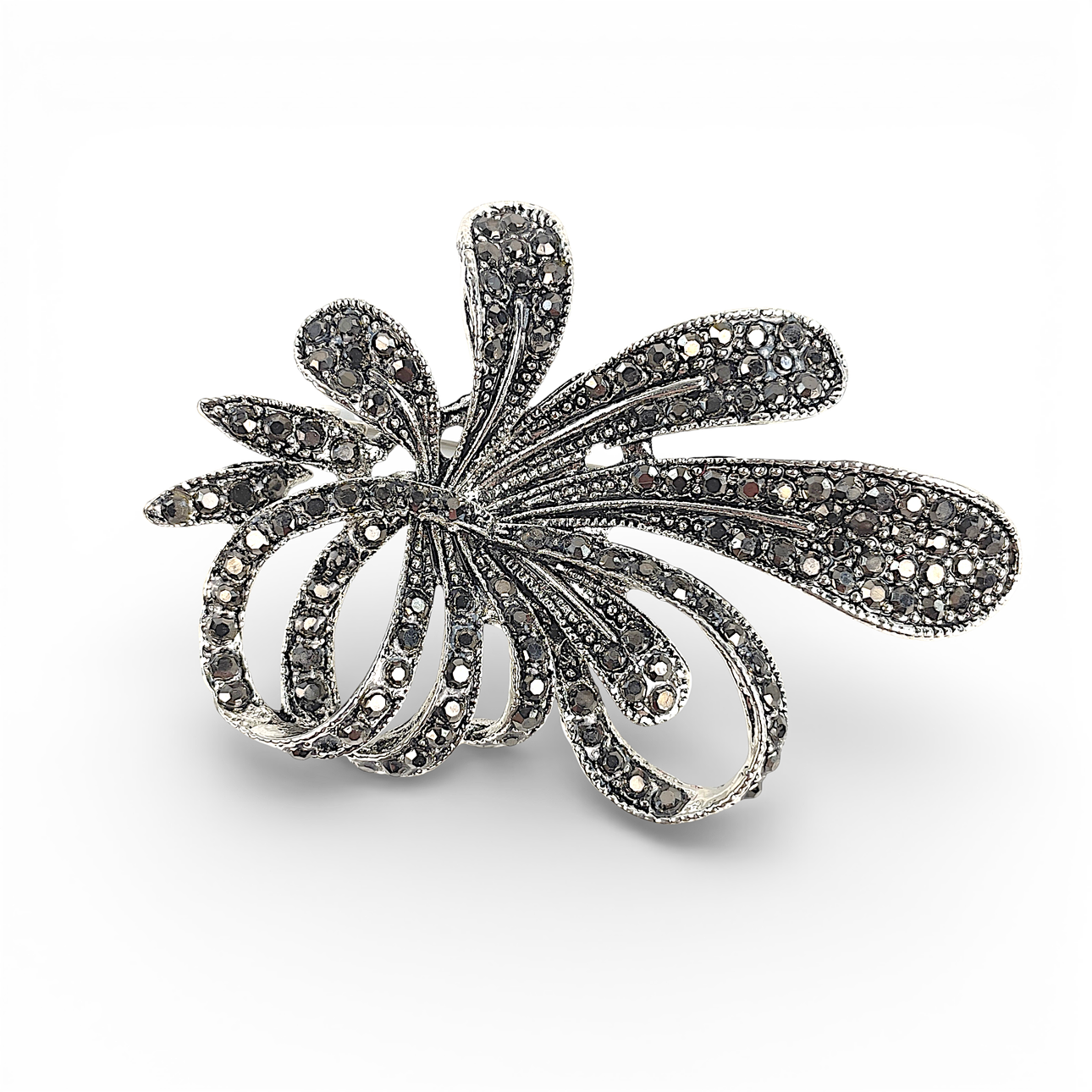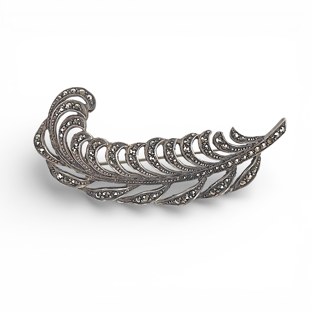 1 st brosch, vitmetall med markasiter, längd ca 6,5 cm.