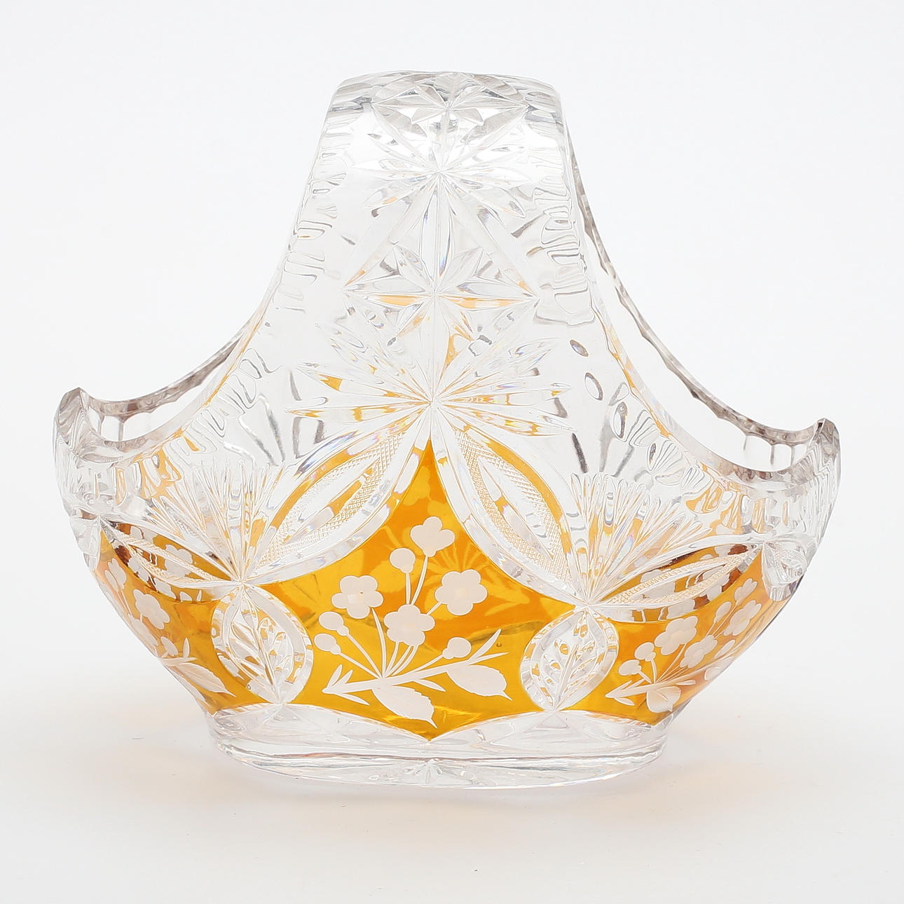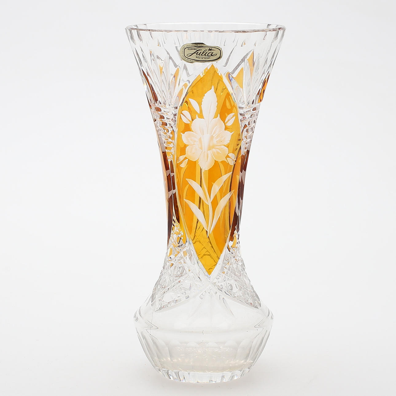 Etsad samt skuren dekor av blomster och bladverk. Ställvis bärnstensfärgad glasmassa. Vas etikettmärkt vid mynning.