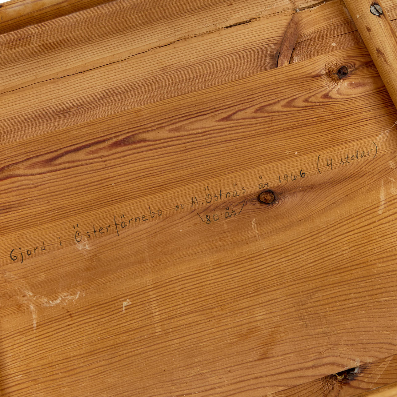 Märkta på sitsarnas underida: "gjord av M Östnär öster-Färnebo 1966" Höjd 88cm Sitthöjd 44cm Bedd 46cm Sittdynor medföljer.