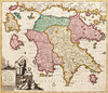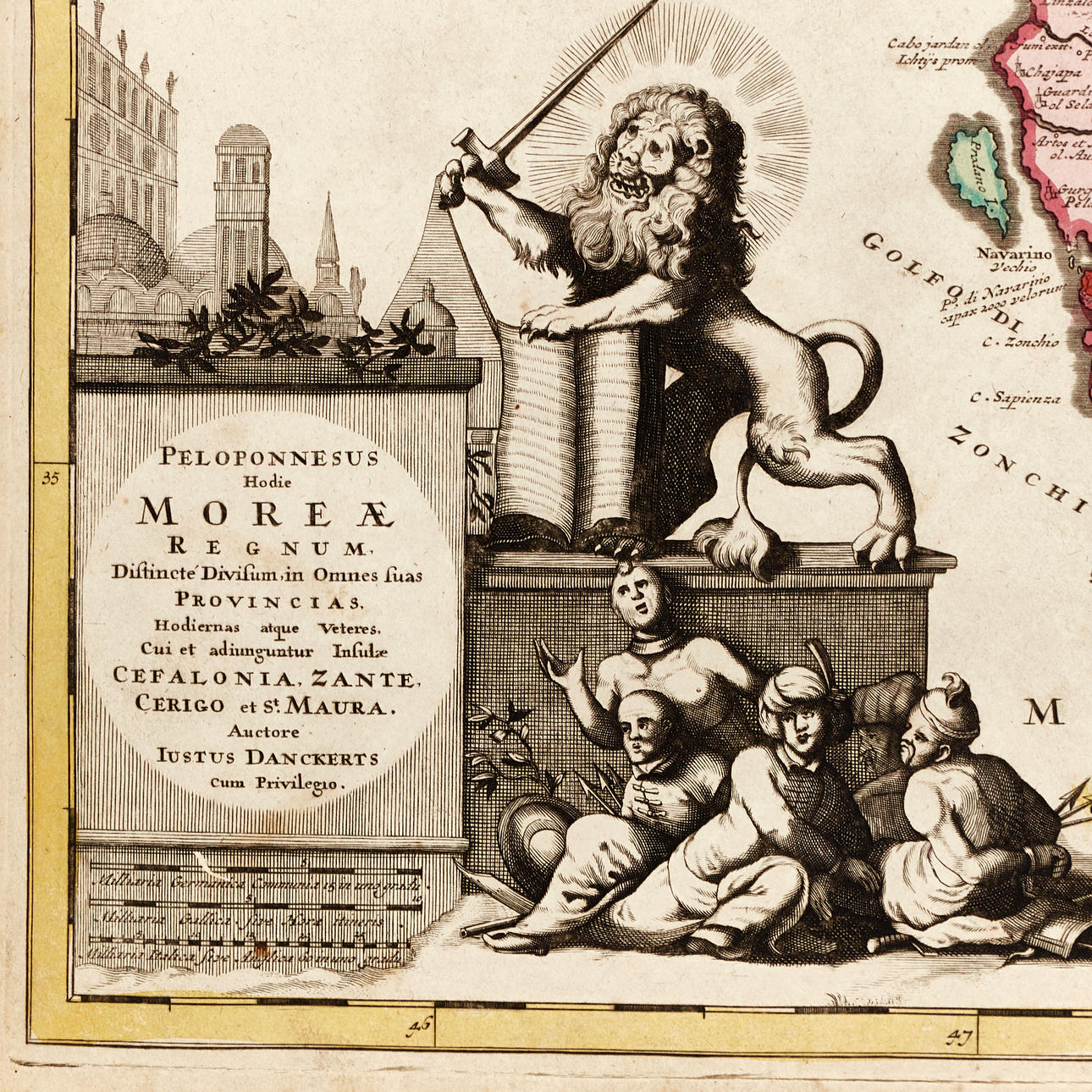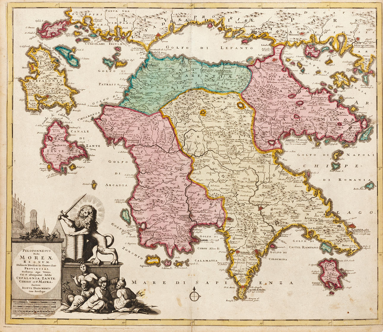 Justus Danckerts (1635-1701), "Peloponnesus Hodie Moreæ Regnum, Distincte Divisum, in Omnes suas Provincias, Hodiernas atque Veteres, Cui et adiunguntur Insulæ Cefalonia, Zante, Cerigo et St. Maura...", graverad och handkolorerad karta över Grekland med öar, ca 1690.