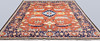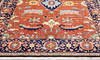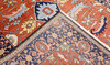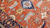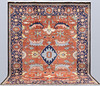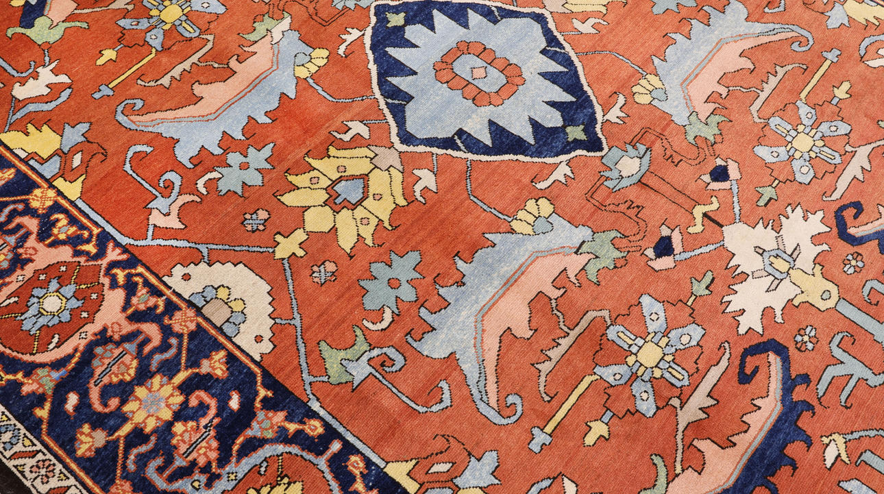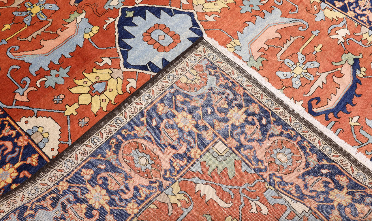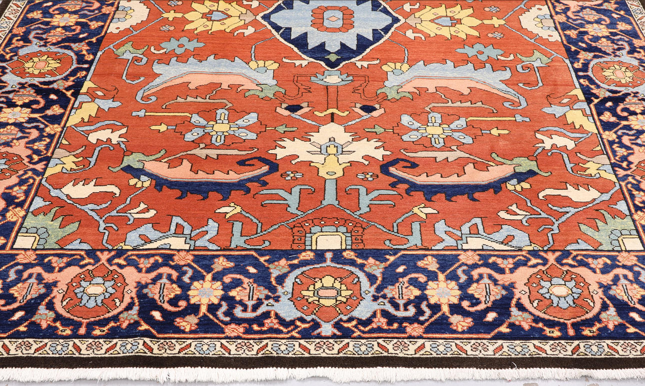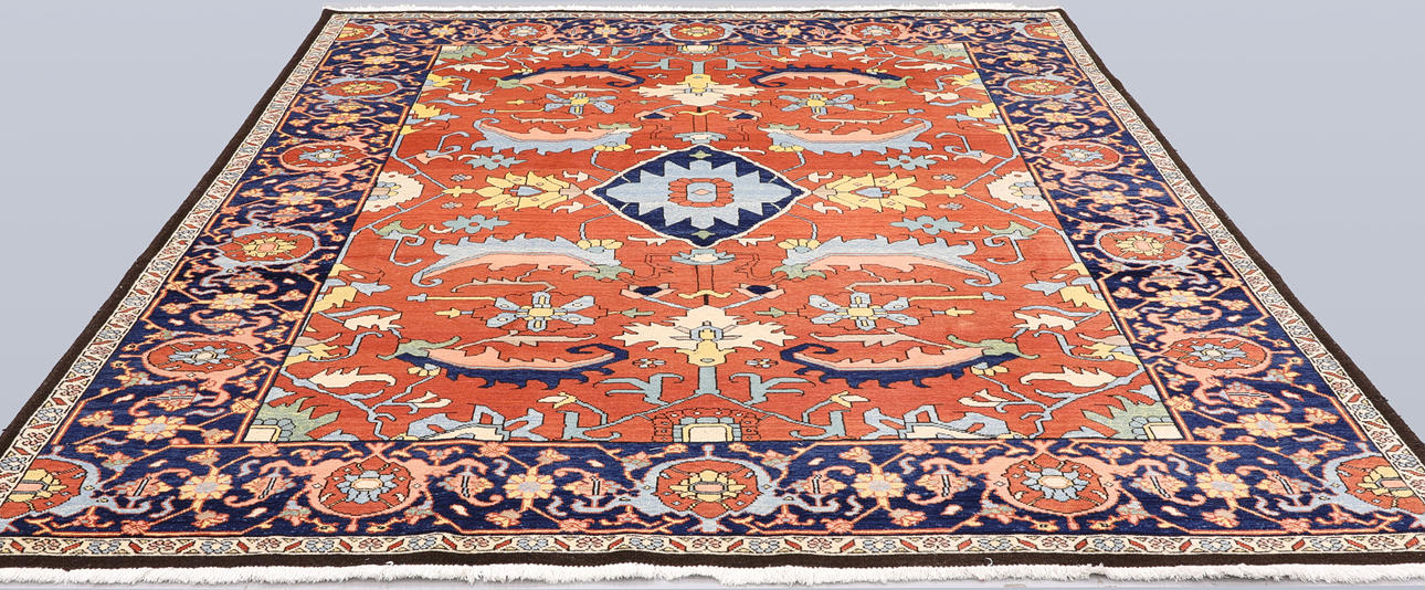 Heriz med tegelröd botten och geometrisk ornamentik i blå, beige och ljusa toner, färgad med växtfärger. Mittfältet domineras av ett centralt medaljongmotiv omgivet av stiliserade blad- och palmettformer. Bården har mörkblå botten. Luggen är av ull och varpen är av bomull.