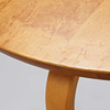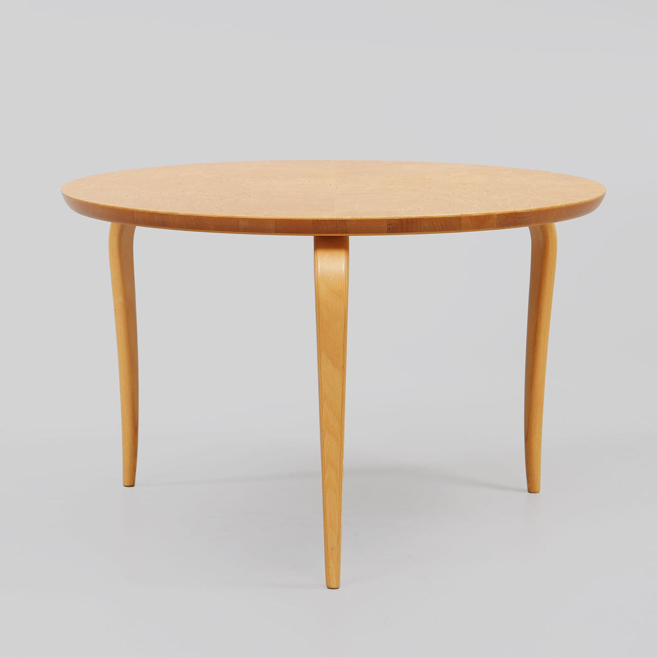 Skiva fanerad med masur, ben av skiktlimmad bok. Brännstämplad. Dia. ca 65 cm, höjd ca 41 cm.