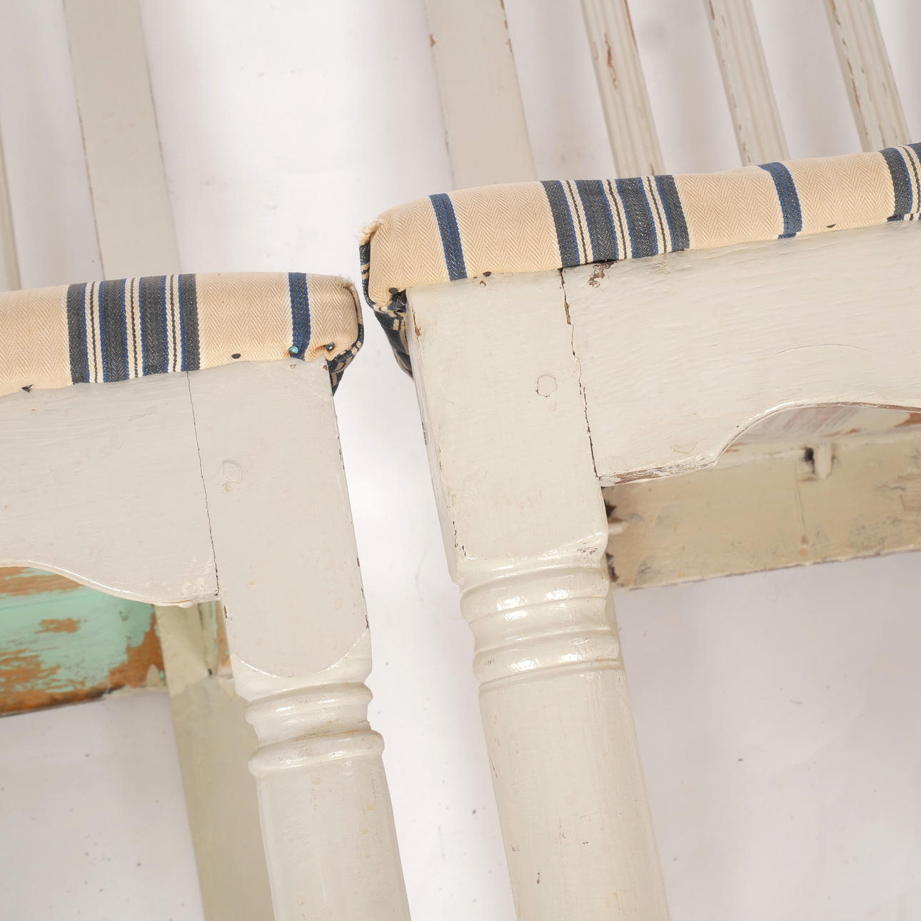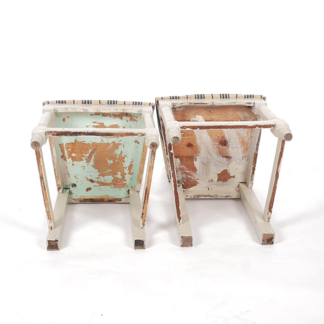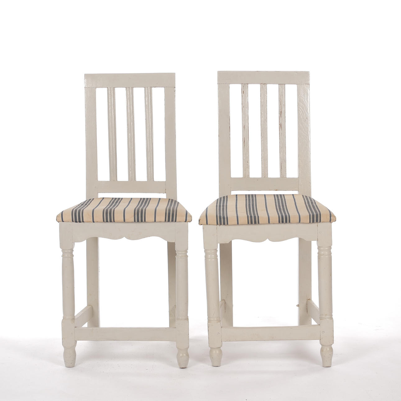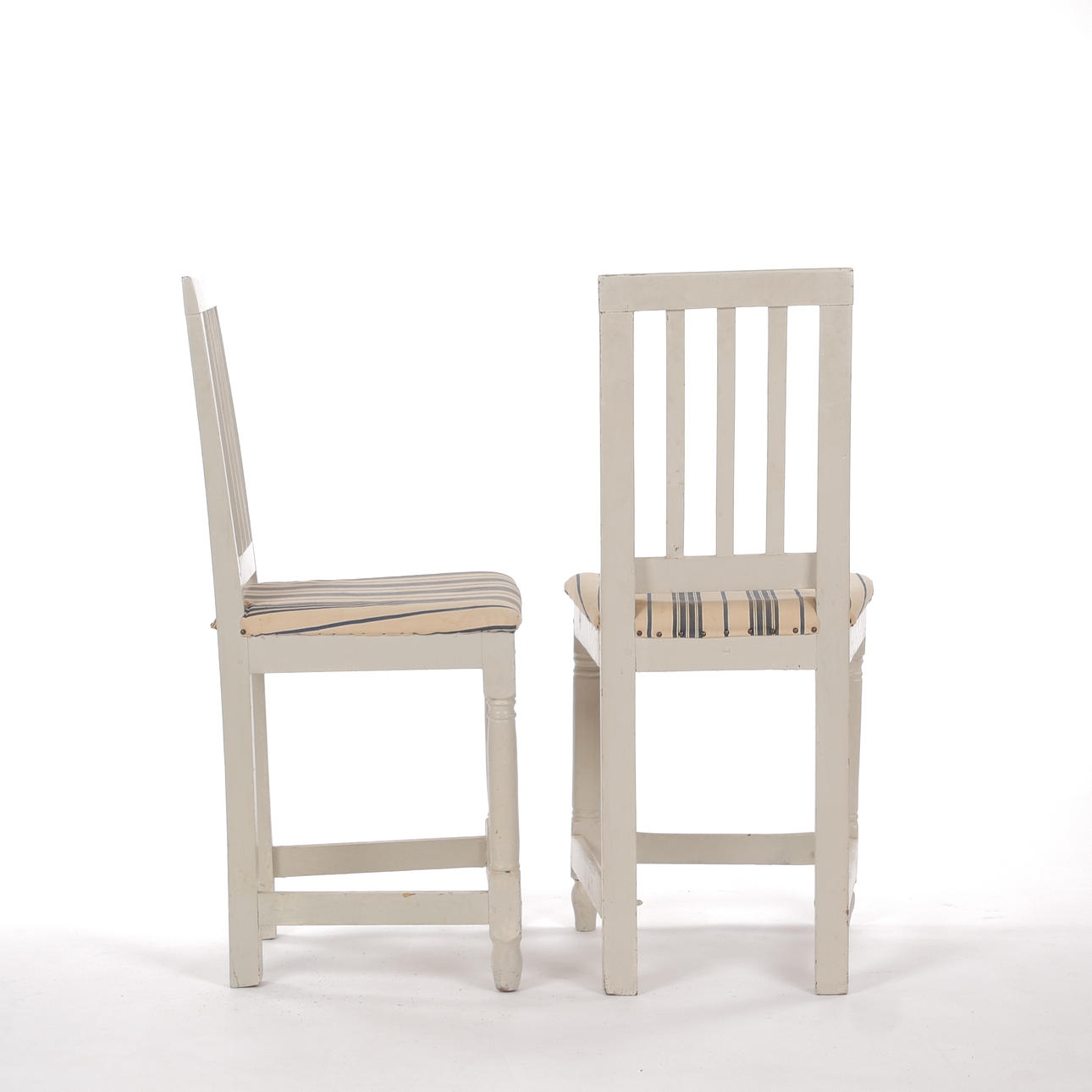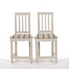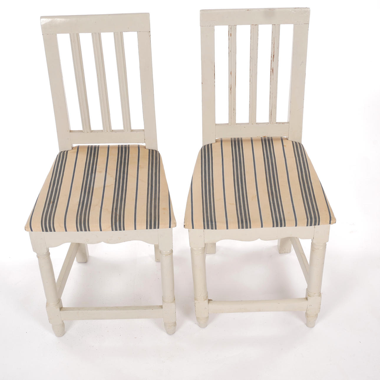 Bruks- och åldersrelaterat slitage. Ena stolen renoverad med bla senare sits och kanter runt sits. Klädsel med fläckar.
