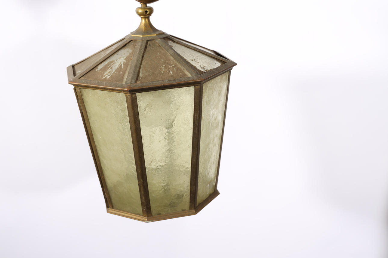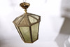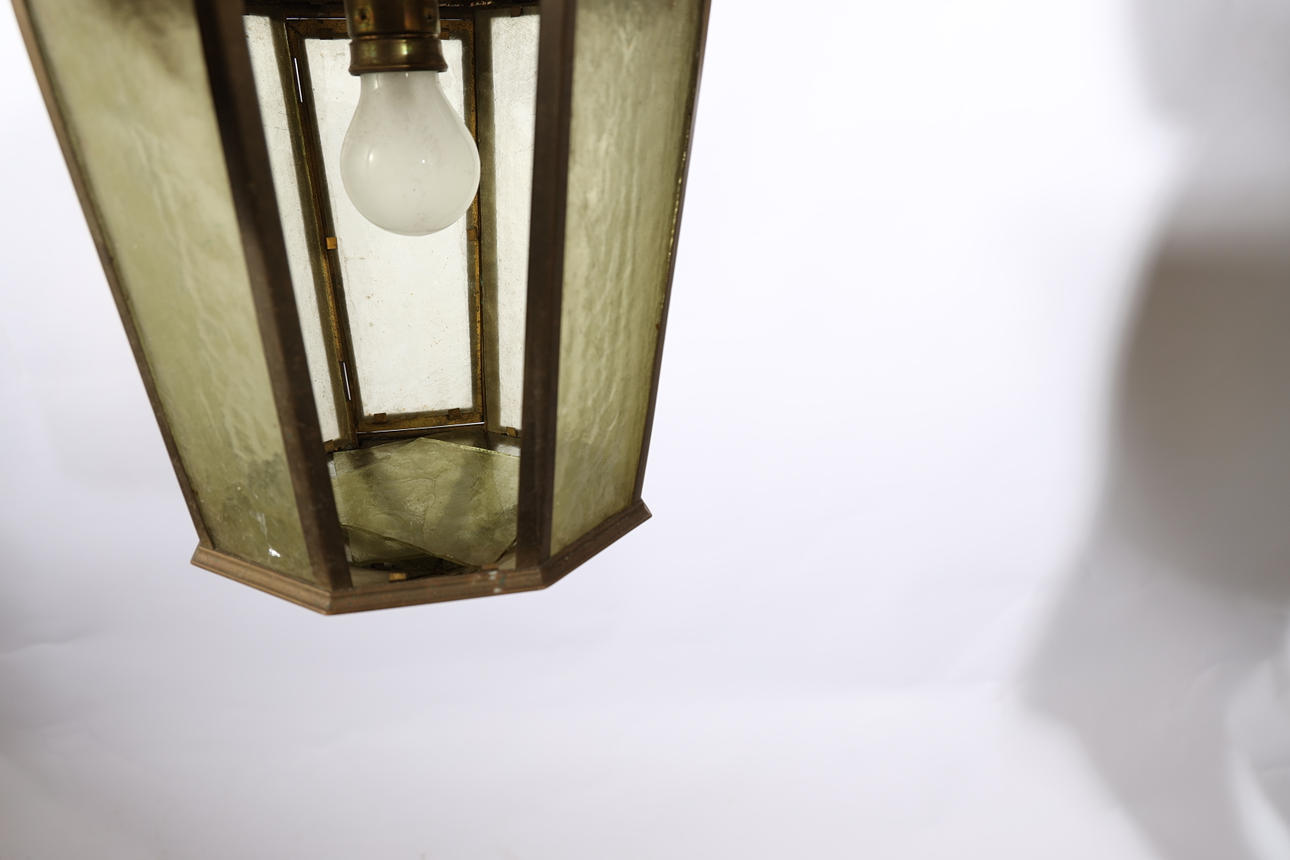 Mässing, med infattat gultonat glas. Höjd 43 bredd 32cm.