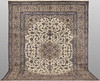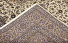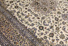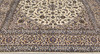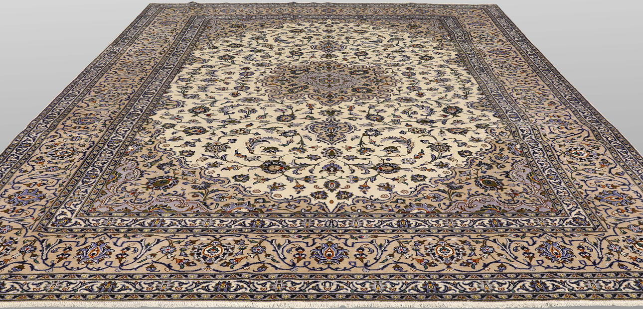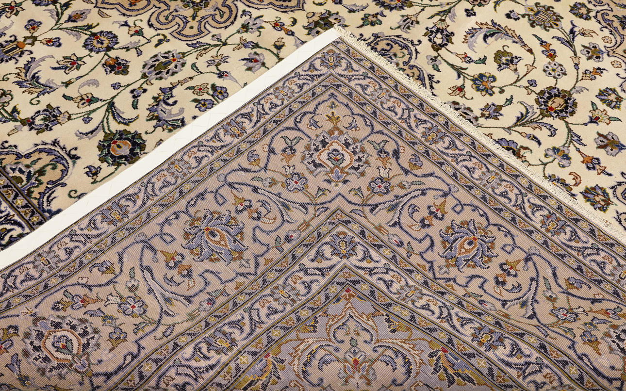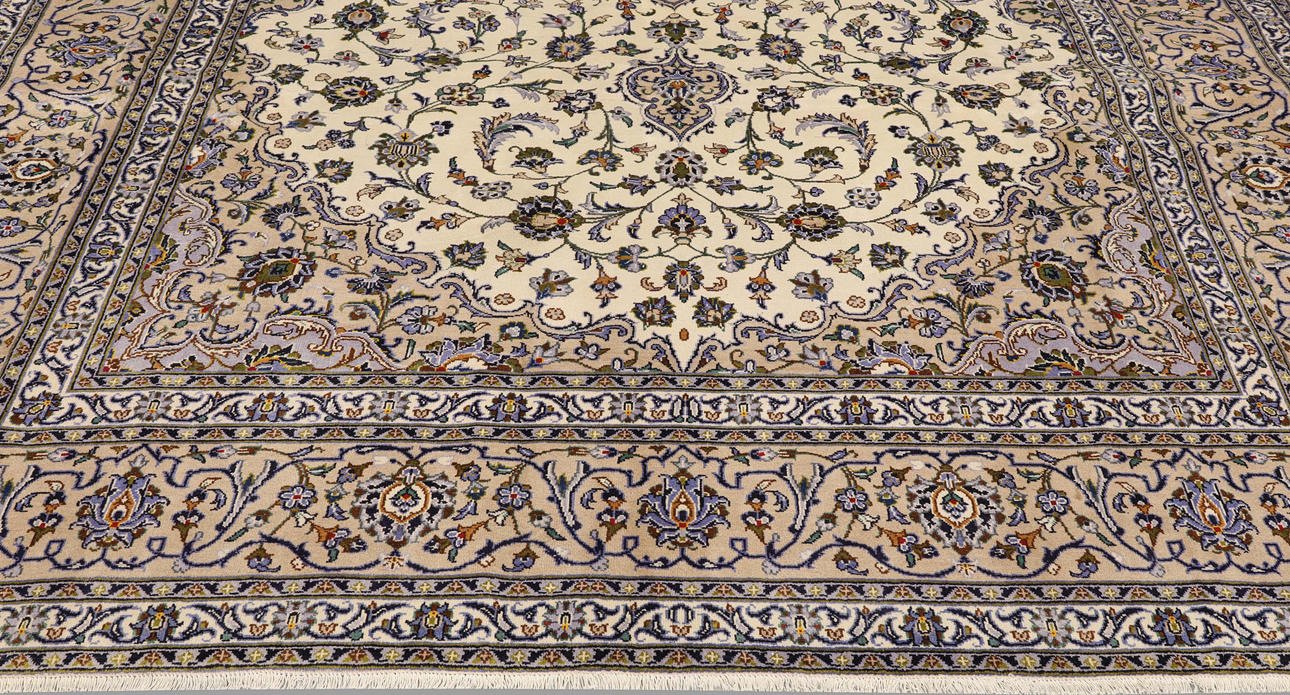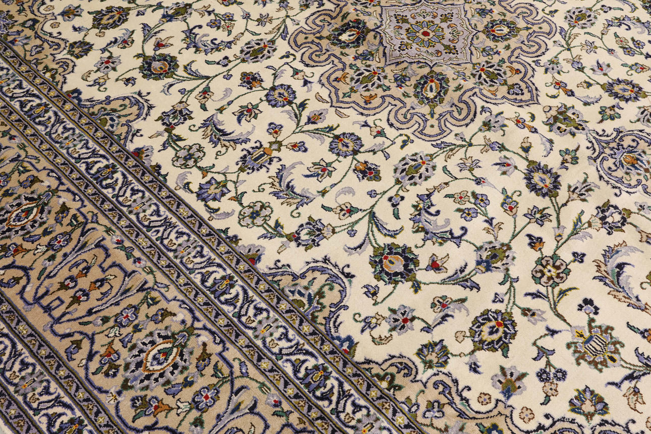 Keshan med ljus bottenfärg och en centralt placerad medaljong med detaljer i blått, beige och grönt. Mittfältet är täckt av floralornamentik, palmetter och arabesker i liknande nyanser, och hörnpartierna följer samma mönsterstruktur. Bården har en beige botten och dekor av upprepade blommotiv. Luggen är av ull och varpen är av bomull.