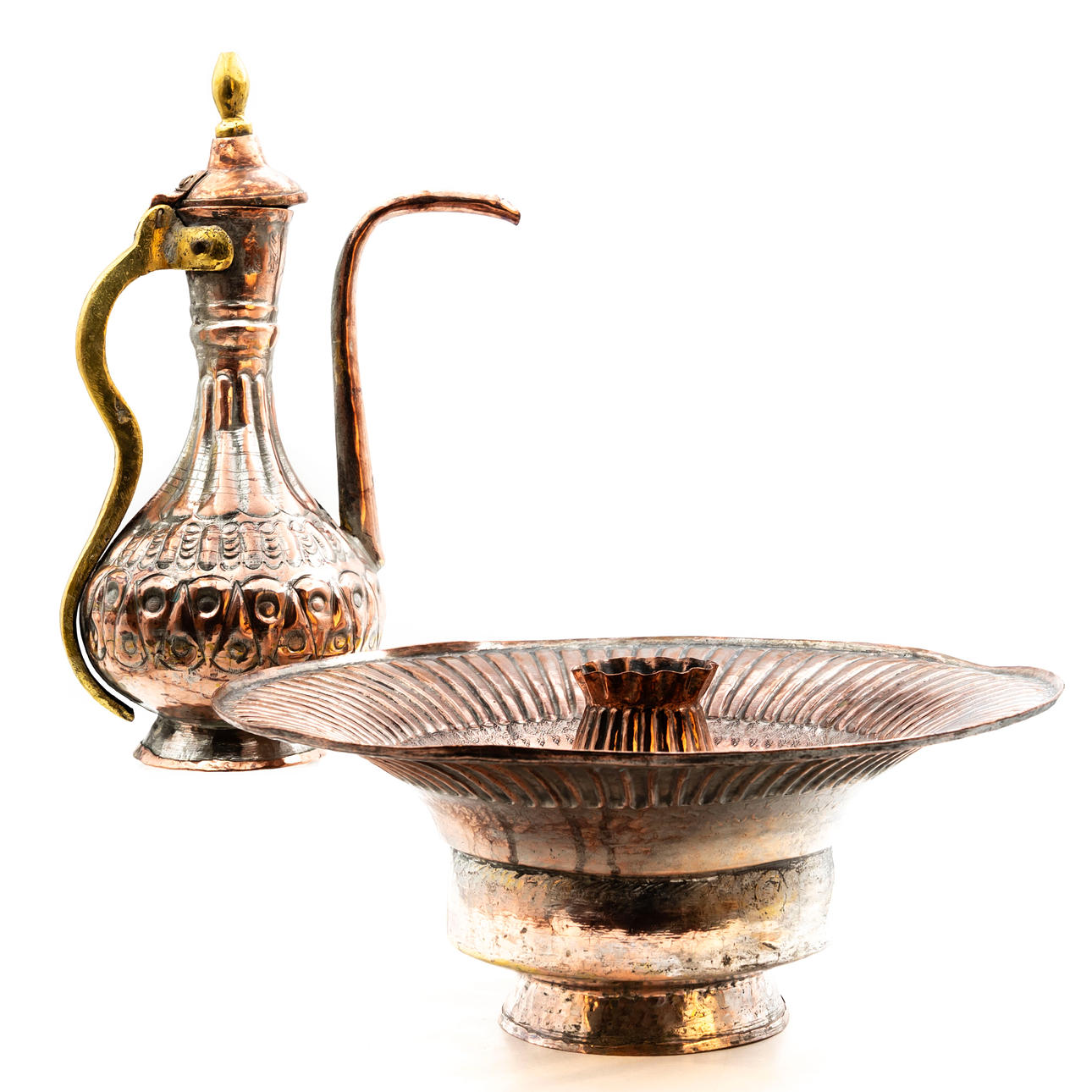 Består av Kanna samt, skål för handtvätt. Kanna, höjd: ca 40 cm Skål, höjd: ca 17 cm, diameter: ca 42,5 cm.