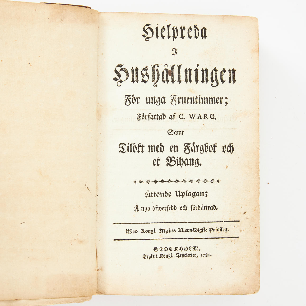 WARG, CAJSA. Hielpreda i hushållningen för unga fruentimmer (..) Samt tilökt med en färgbok och et bihang. Åttonde uplagan; å nyo öfwersedd och förbättrad, Stockholm 1781.
