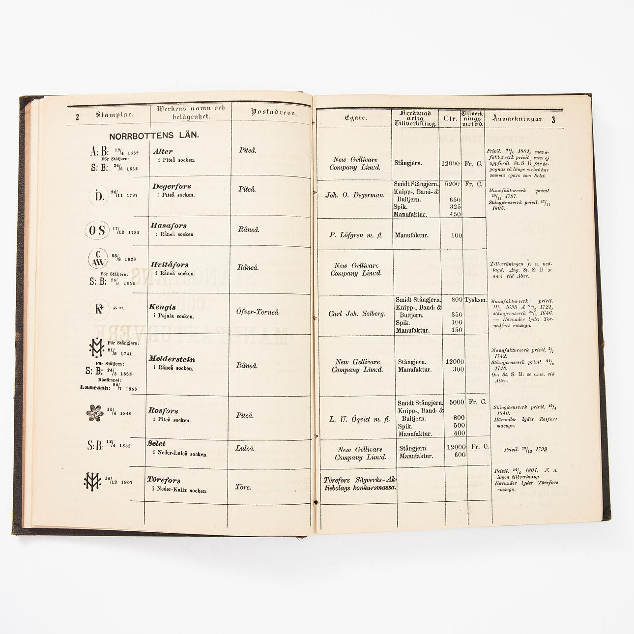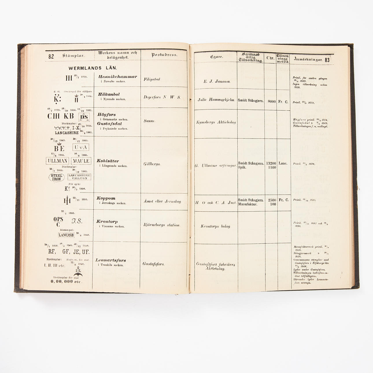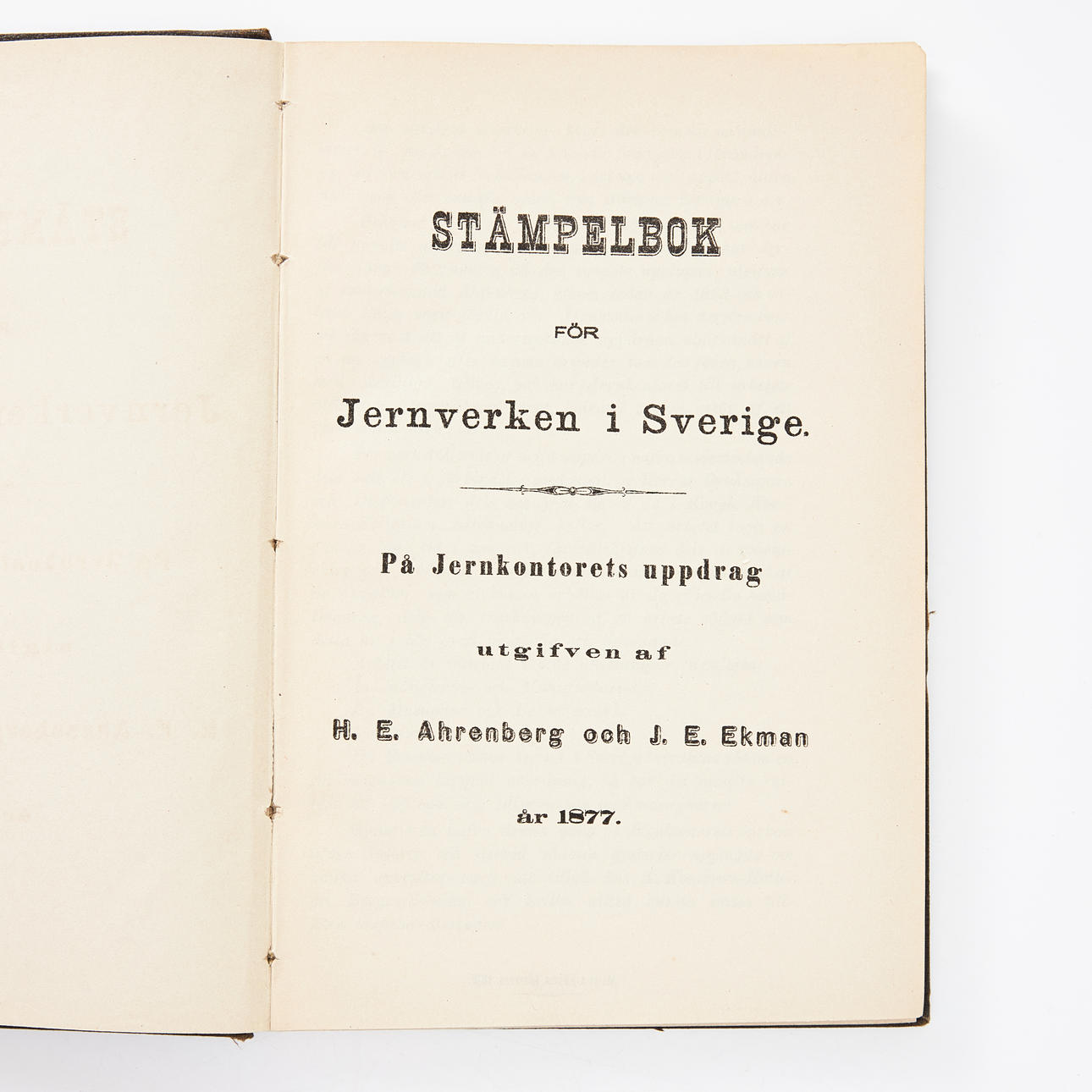 ARENBERG, H. E. / EKMAN, J. E. Stämpelbok för jernverken i Sverige. På Jernkontorets uppdrag, Göteborg, (Meyer & Köster) 1877.