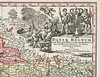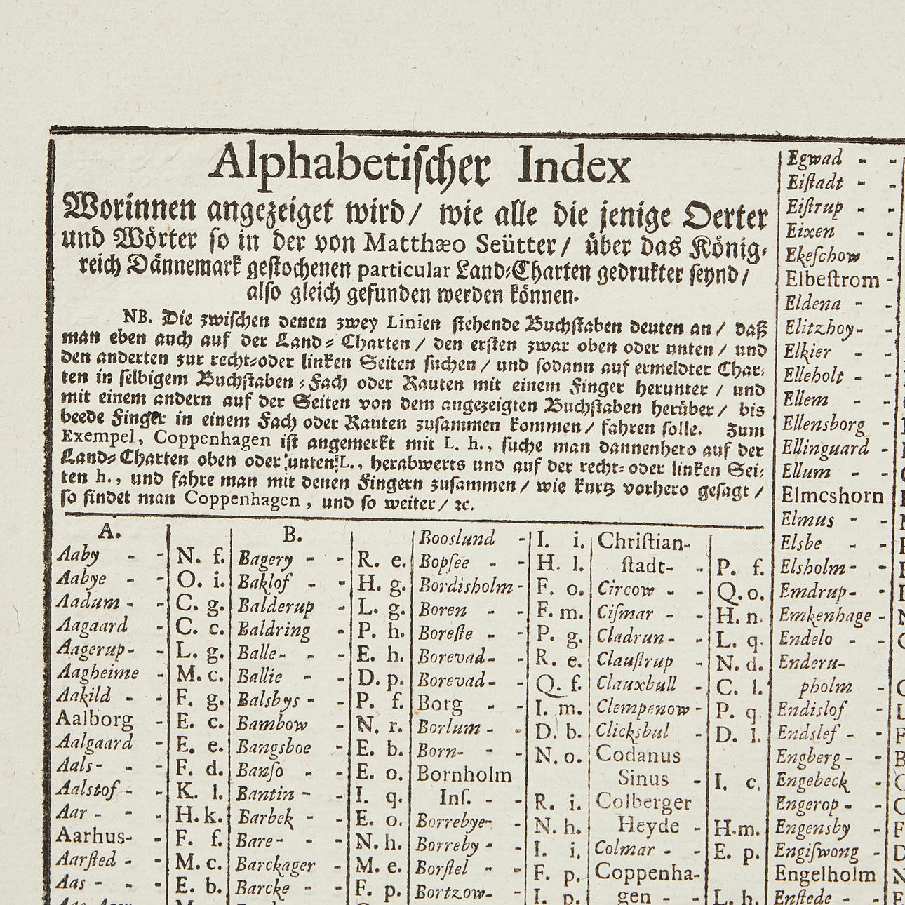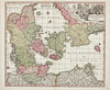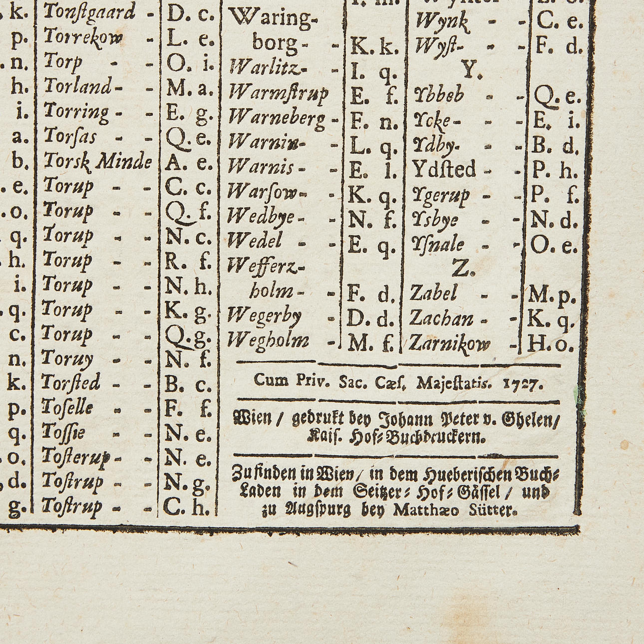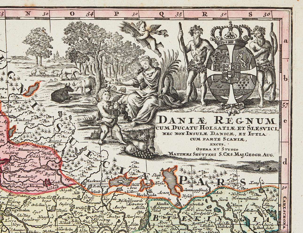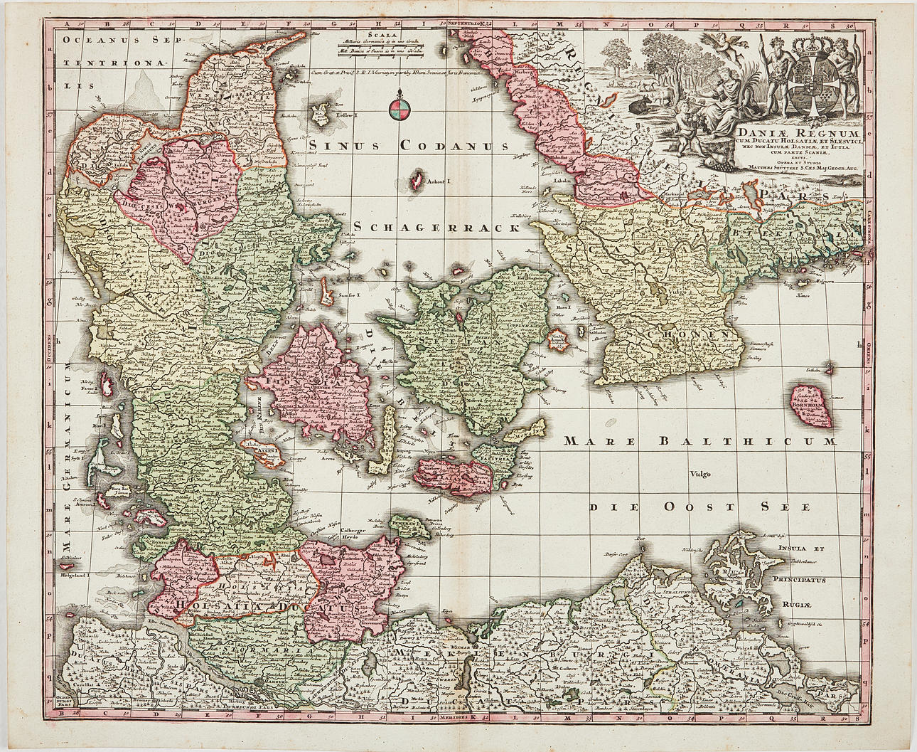SEUTTER, M. Daniae Regnum cum ducatu Holsatiae et Slesvici, nec non insulae Danicae, et Iutia cum parte Scaniae ...Augsburg, ca 1740, handkolorerad graverad karta med figurativ kartusch i svartvitt med danska riksvapnet.