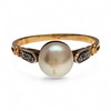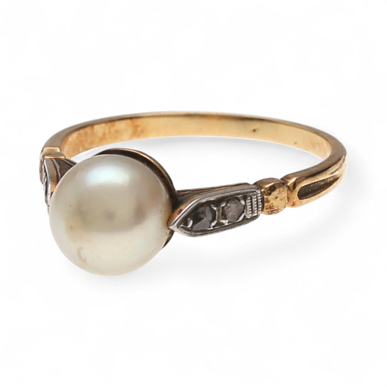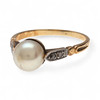 18K guld med platinautsikt, rosenslipade diamanter, ca 0.05 ct. och odlad pärla 8 mm i diameter. Storlek 17/57. 3,4 gr.