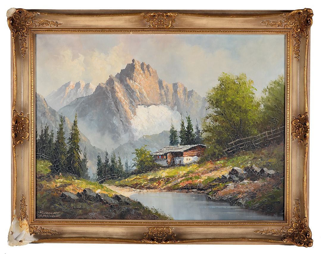 484996. RUDOLF ADAMEK. Idylliskt bergslandskap med alpin hydda.