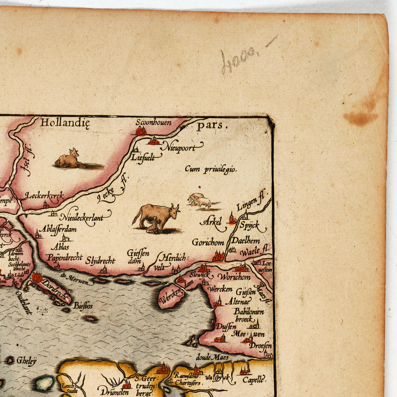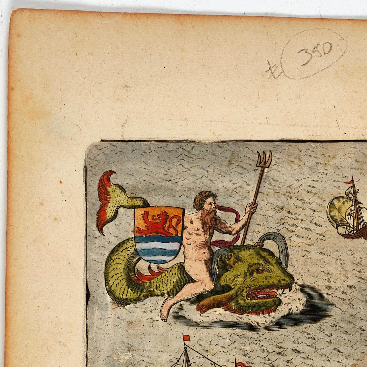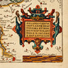 I nedre högra hörnet den stora, kolorerade titelkartuschen, och därunder måttskalan. I övre högra hörnet Poseidon ridande på ett havmonster och bärandes provinsens vapensköld som visar ett lejon som kämpar sig upp ur vågorna, och därtill tre skepp. På kartans övre del är olika boskapsdjur avbildade och en kvinna som mjölkar en ko.