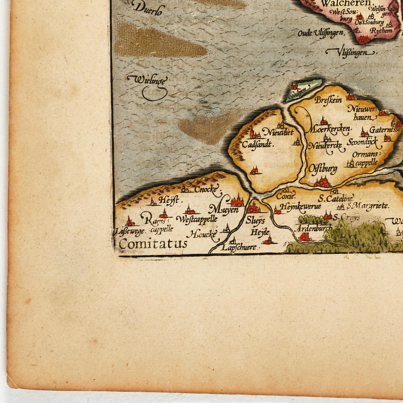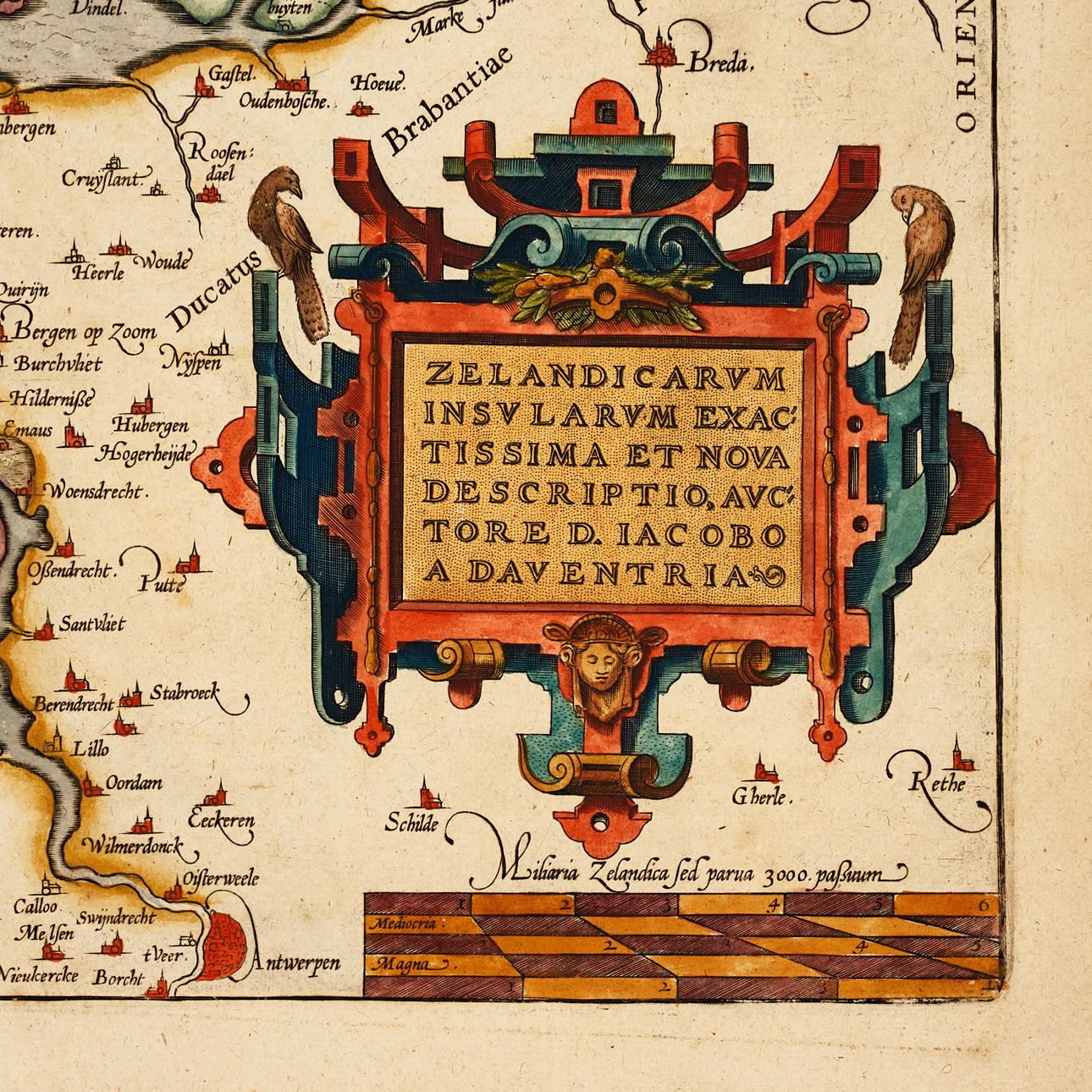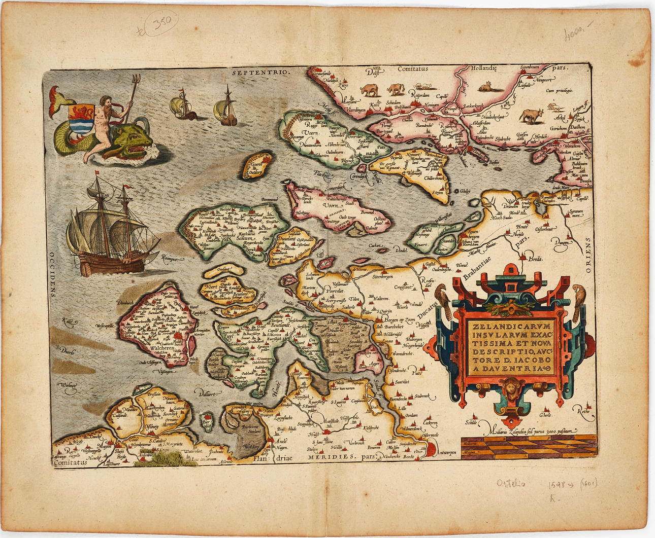 Abraham Ortelius (1527-1598), "Zelandicarum Insularum Exactissima Et Nova Descriptio, Auctore D. Jacobo A Daventria", graverad och handkolorerad karta över provinsen Zeeland, ur Ortelius "Theatrum Orbis Terrarum". Latinsk utgåva 1603 (1603L46 300 exemplar).