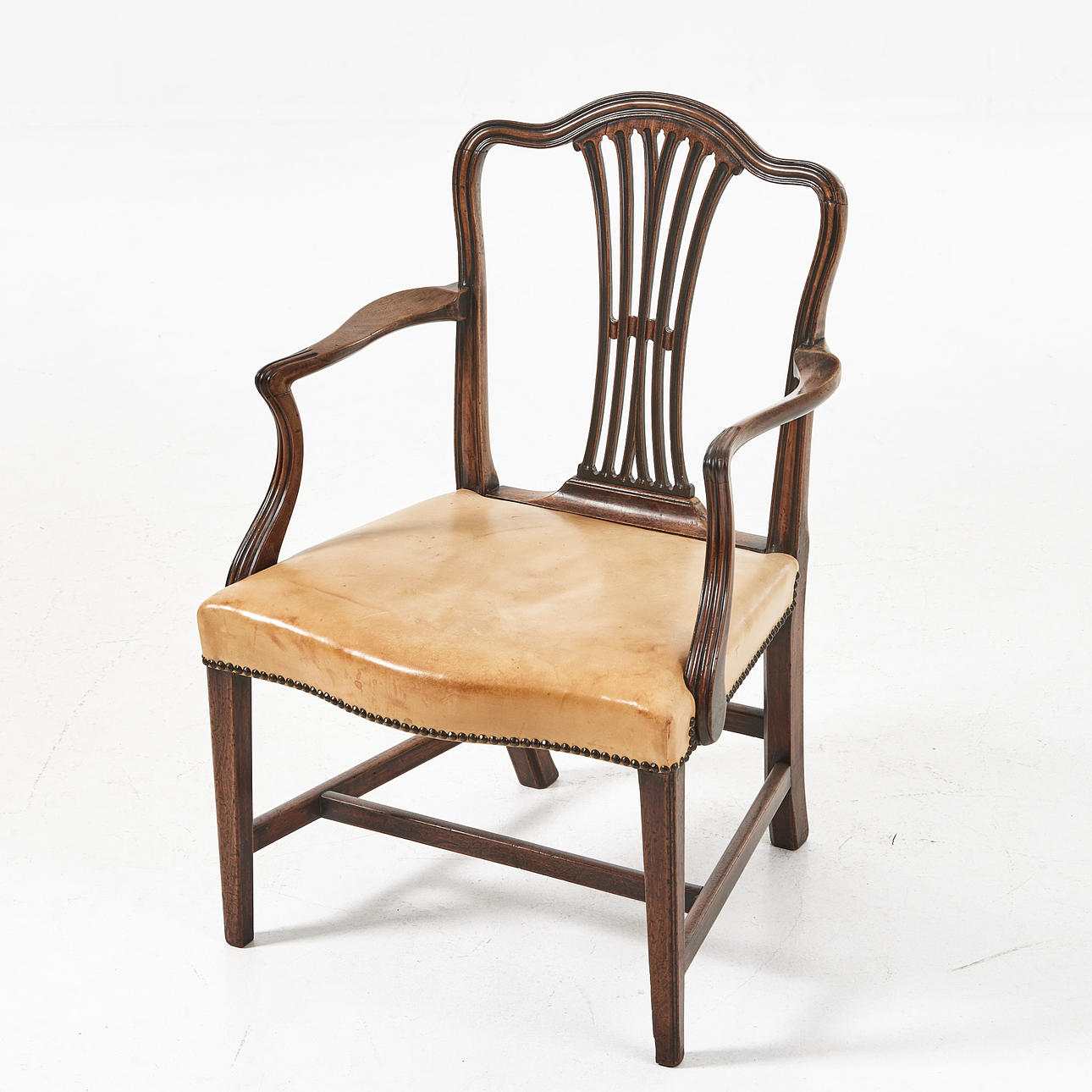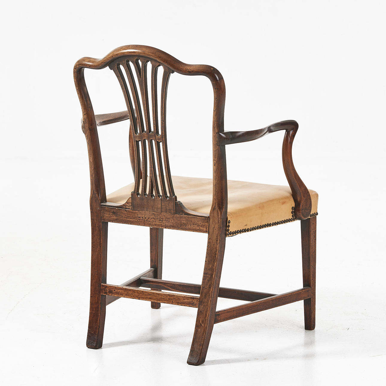 Genombruten ryggbricka, sits med ljus läderklädsel, pärlspikad, höjd ca 45, rygg 92 cm.