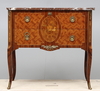 Fanerad i jakaranda m.fl träslag, intarsia med rosor, beslag i mässing, stenskiva. Längd 80, bredd 44, höjd 75 cm.
