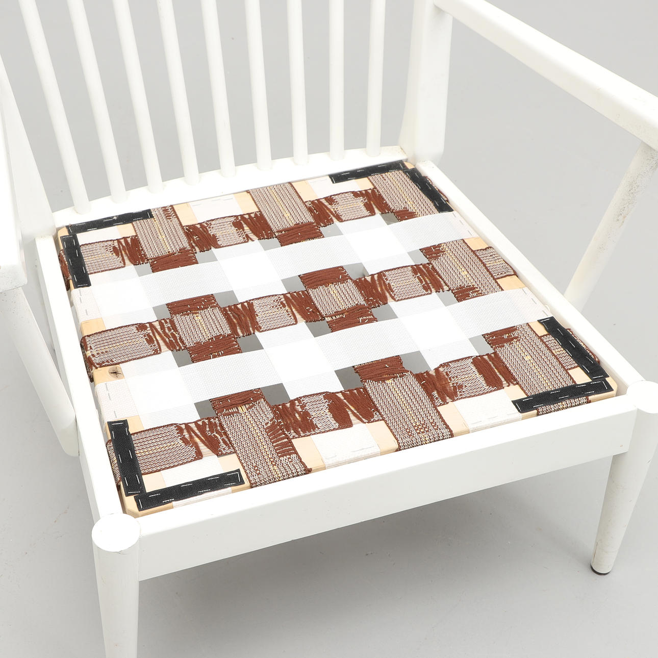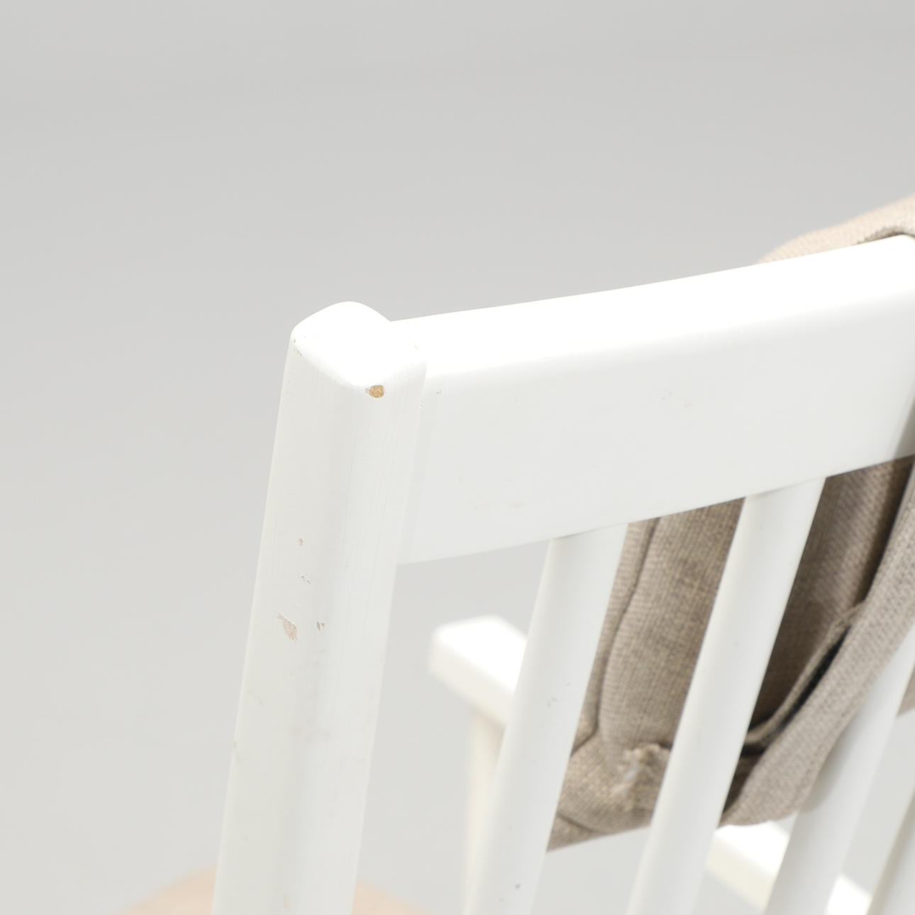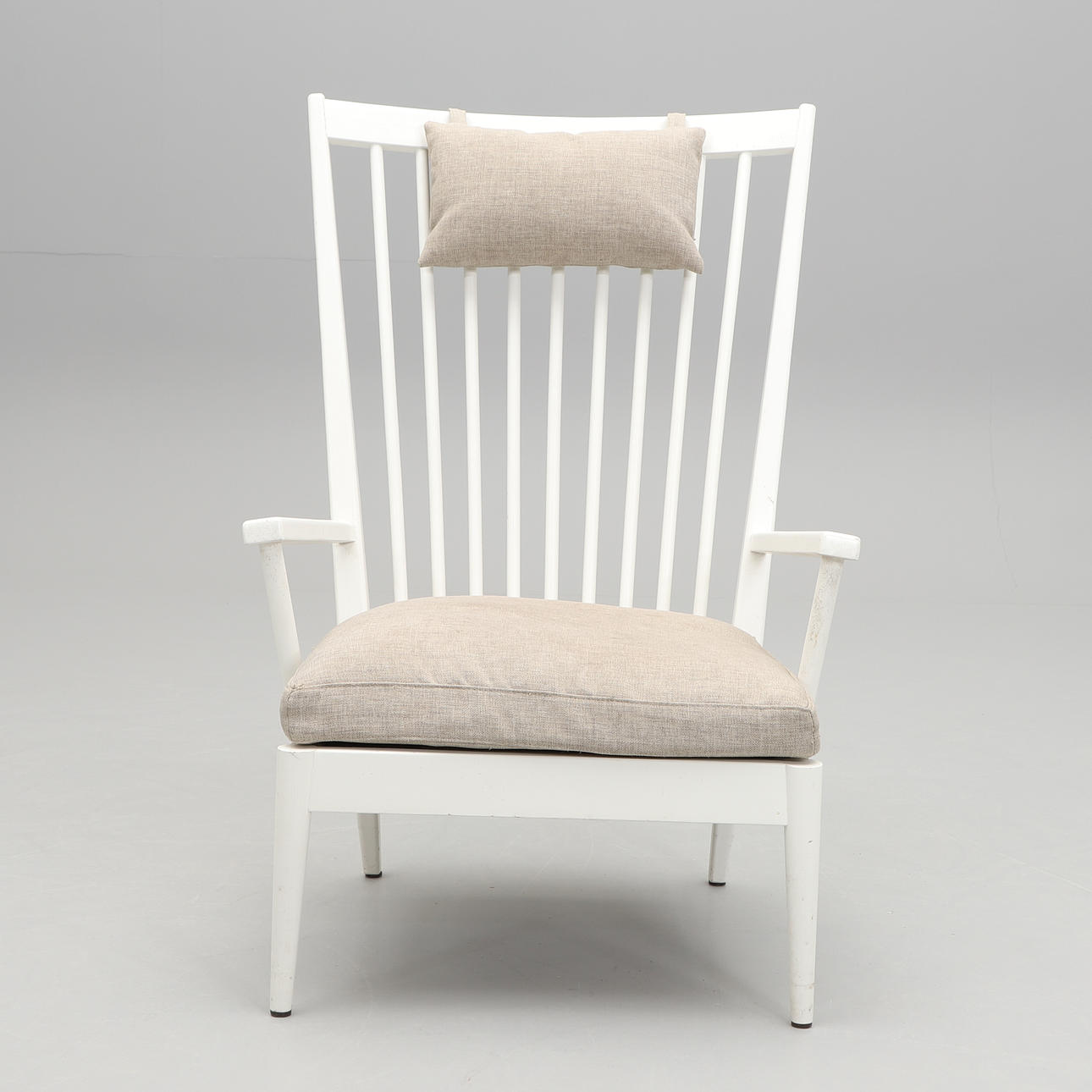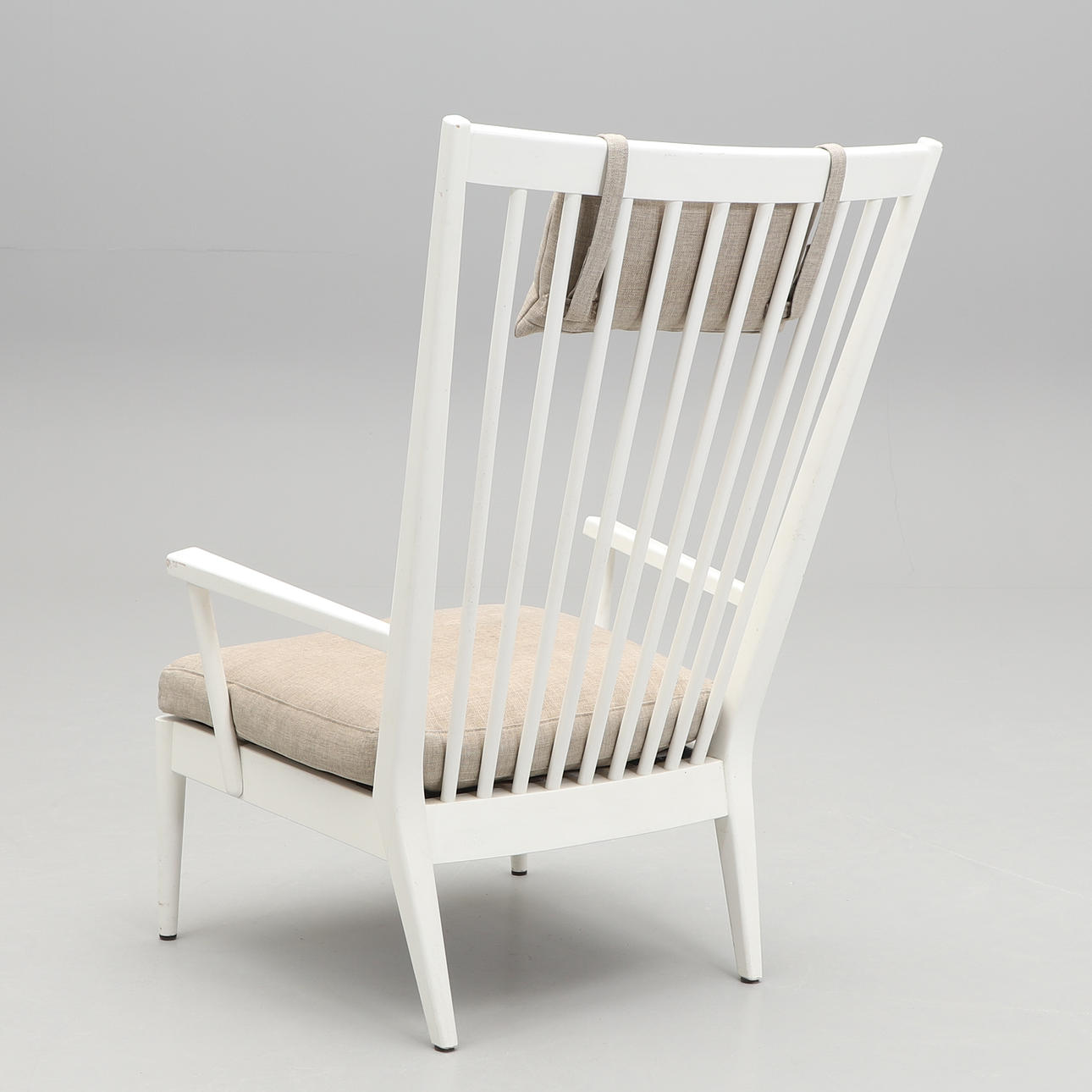 Vitlackerad med pinnrygg. Lös stoppad sittdyna och nackkudde. Bredd 73, djup c:a 80, höjd 109 cm.