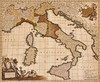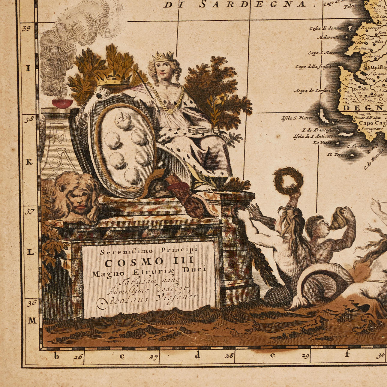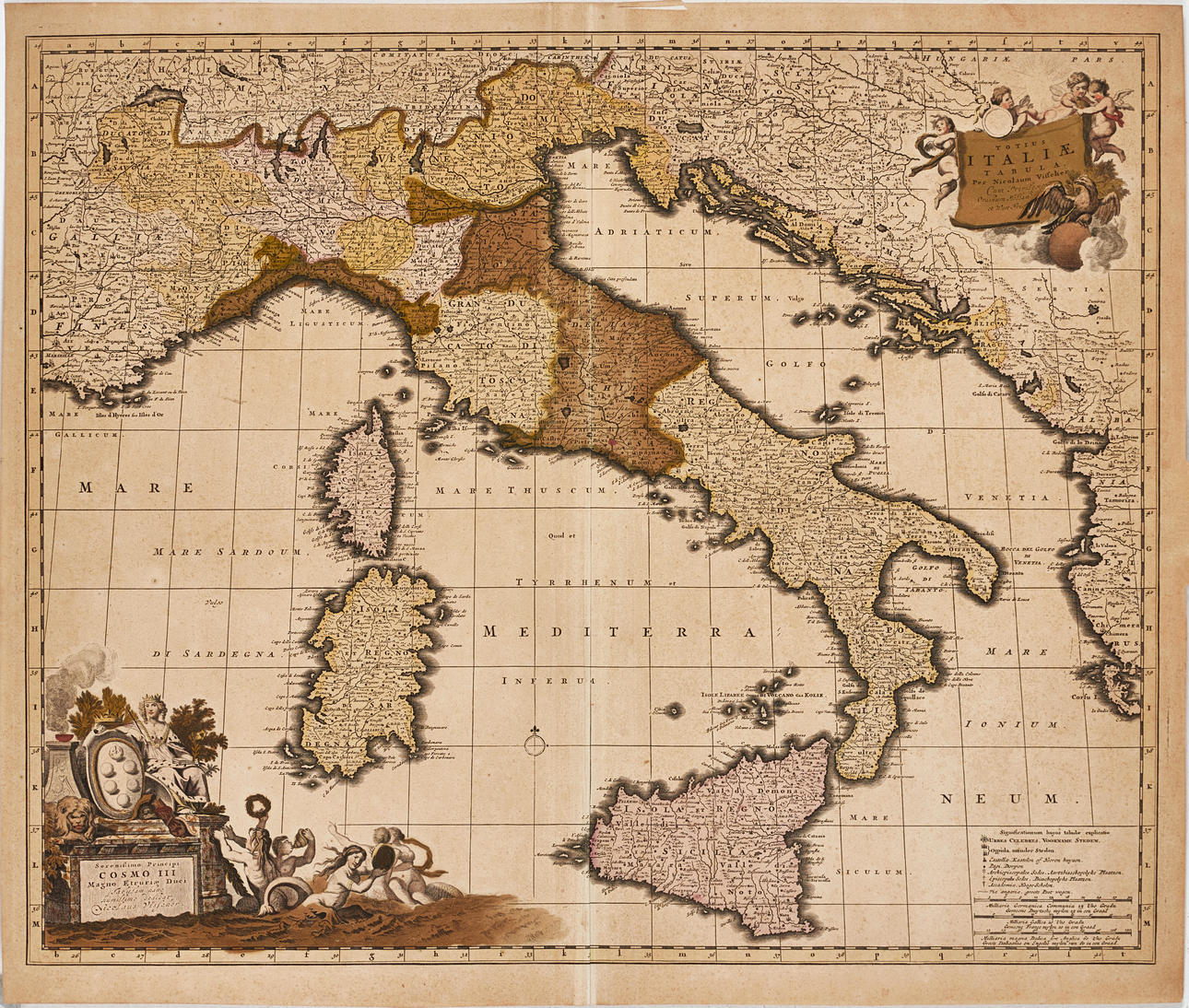 Skador. Missfärgad. Kraftigt mittveck samt med flertalet veck längs med mittvecket. Bristningar i papperet längs med nedre vänstra kartuschen, samt mitt på kartan (ovanför Perugia). Skärskada (ca 35mm) på bladets övre kant.