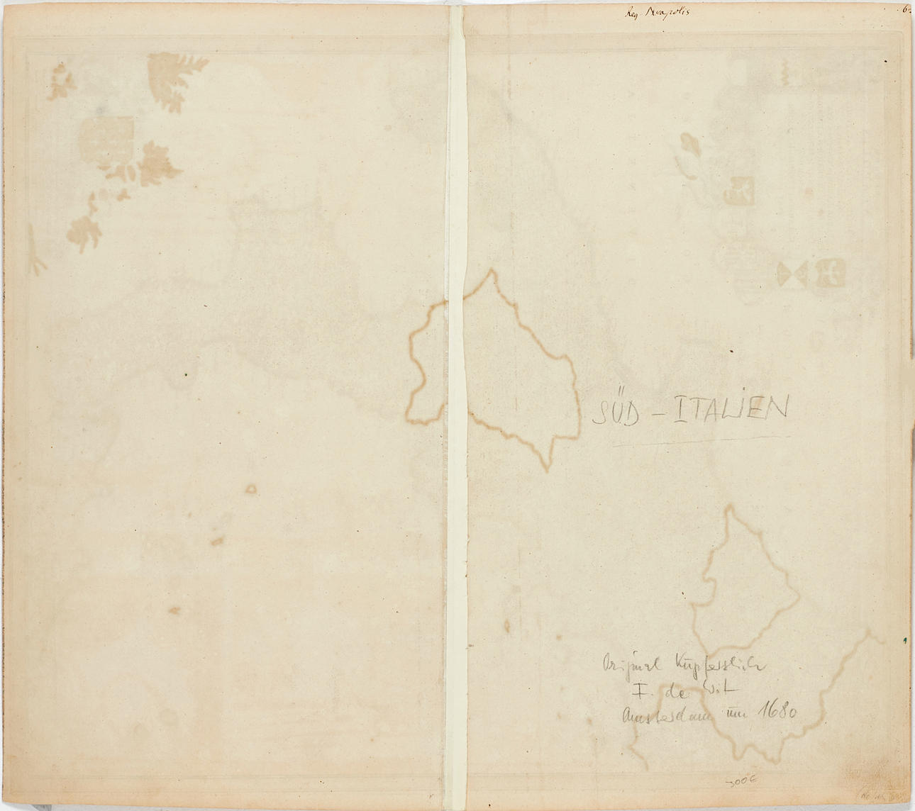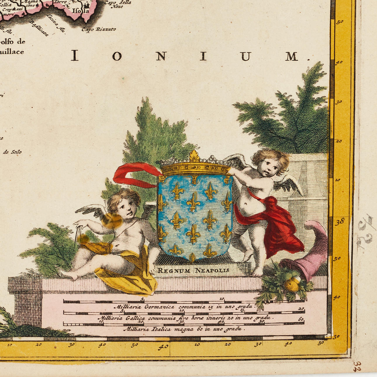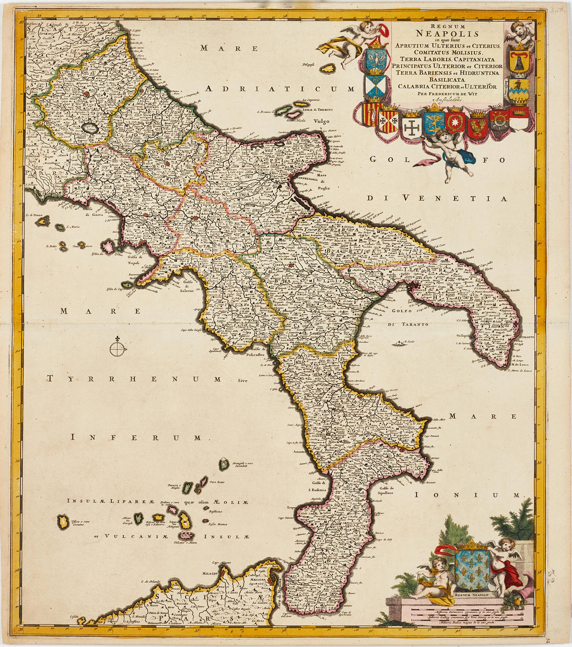 Frederick de Wit (1629-1706), "Regnum Neapolis in quo sunt Aprutium Ulterius et Citerius, Comitatus Molisius, Terra Laboris, Capitaniata Principatus Ulterior et Citerior Terra Bariensis et Hidruntina Basilicata Calabria Citerior et Ulterior...,", graverad och handkolorerad karta över Kungariket Neapel, ca 1680.