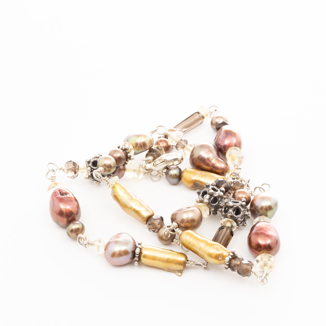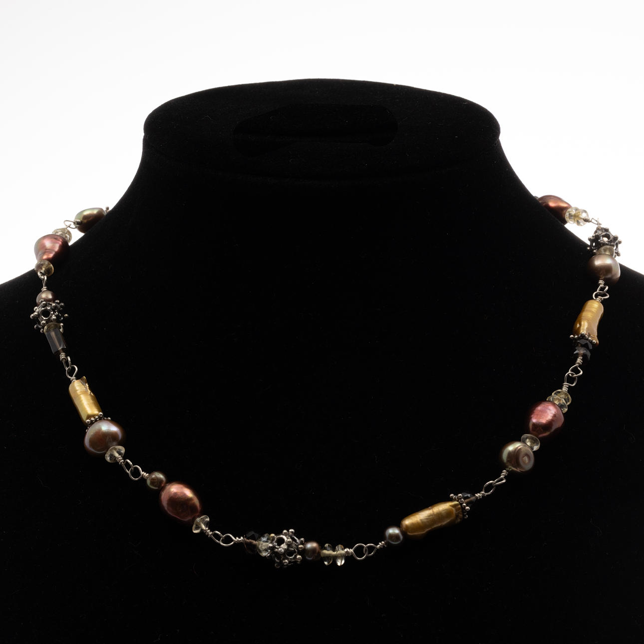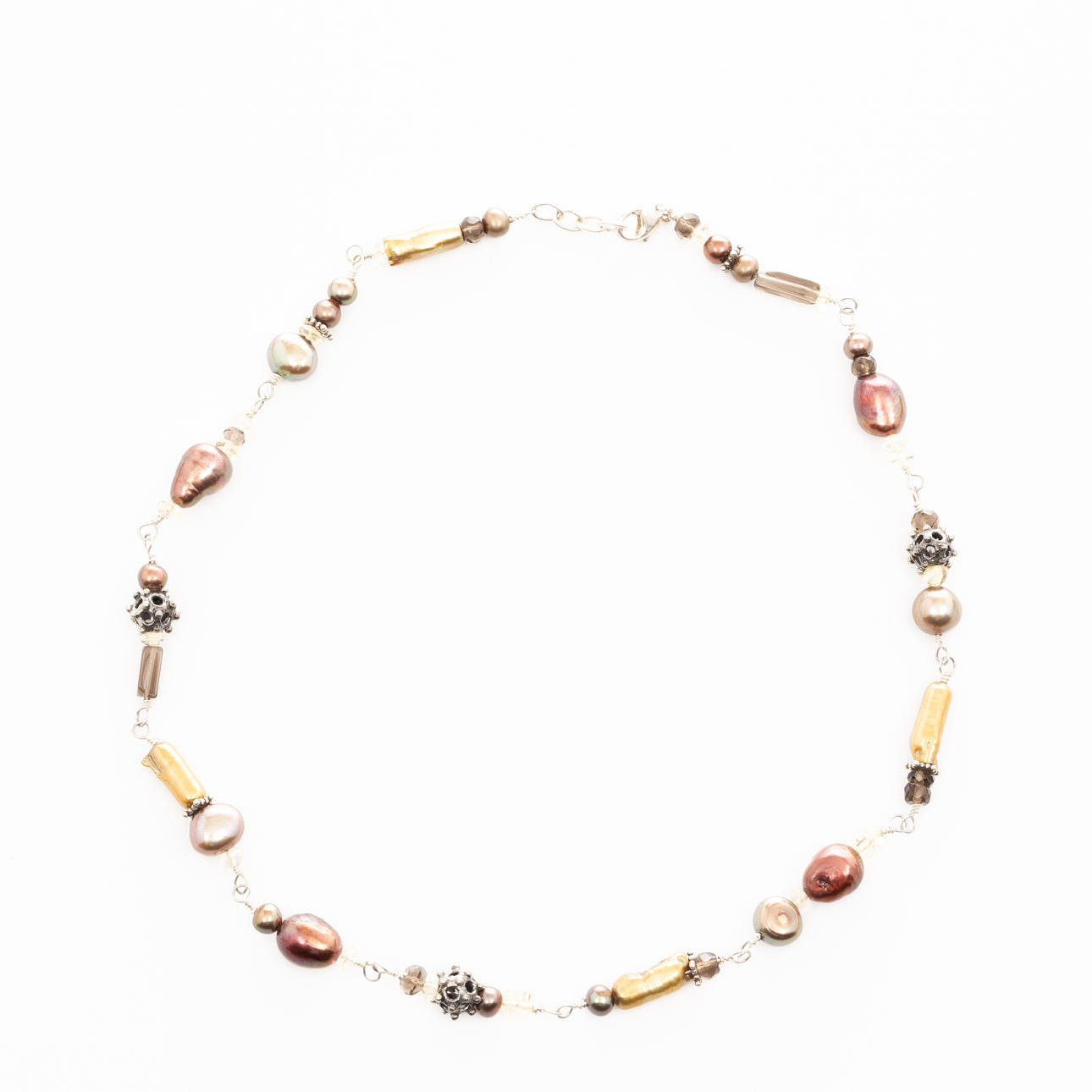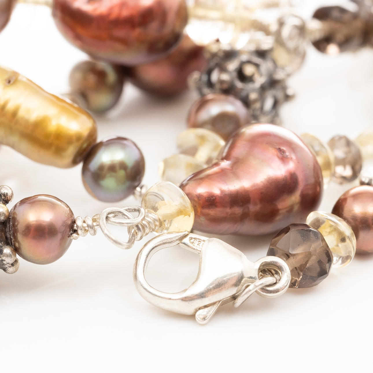 Collier i sterlingsilver med odlade pärlor, slipade citriner och rökkvarts