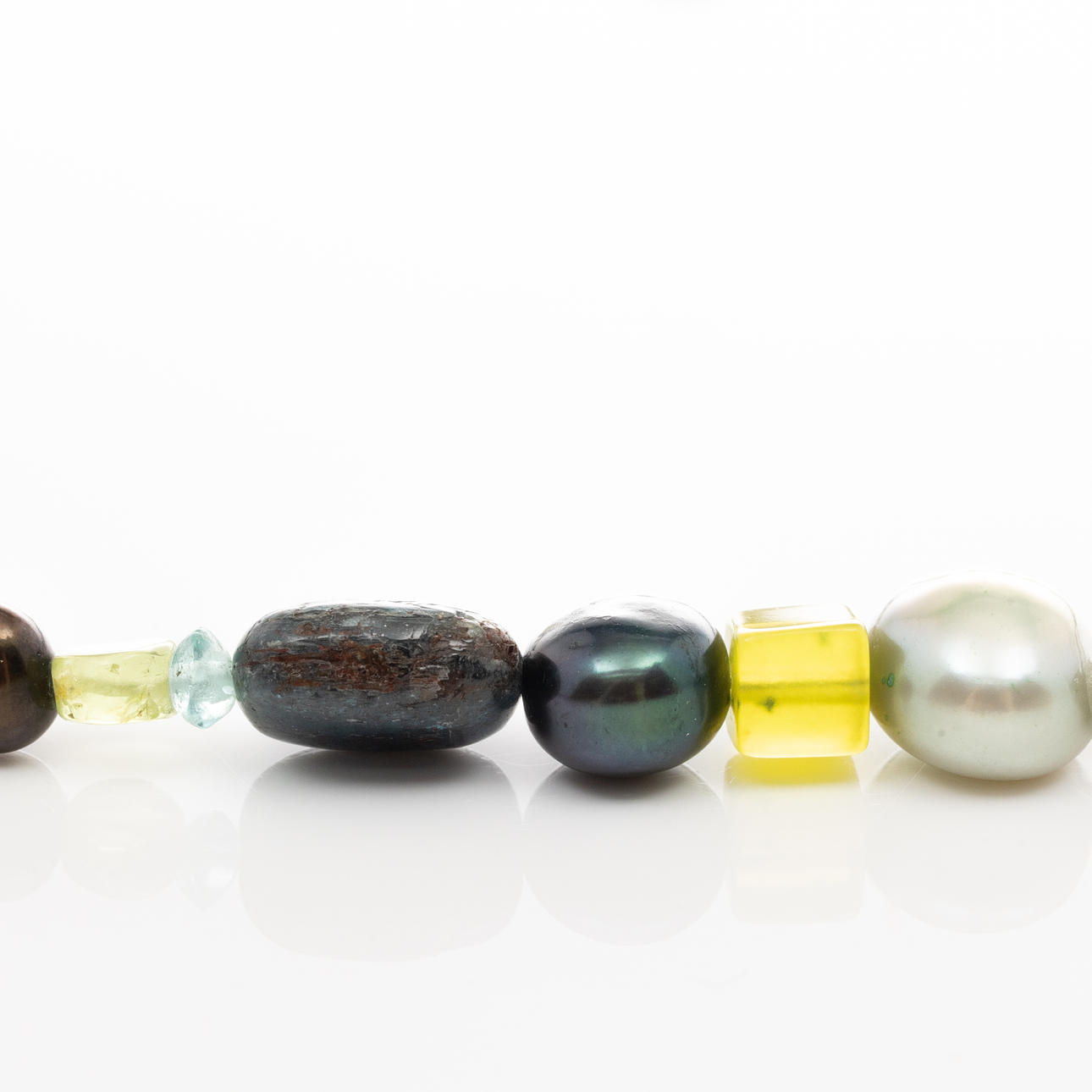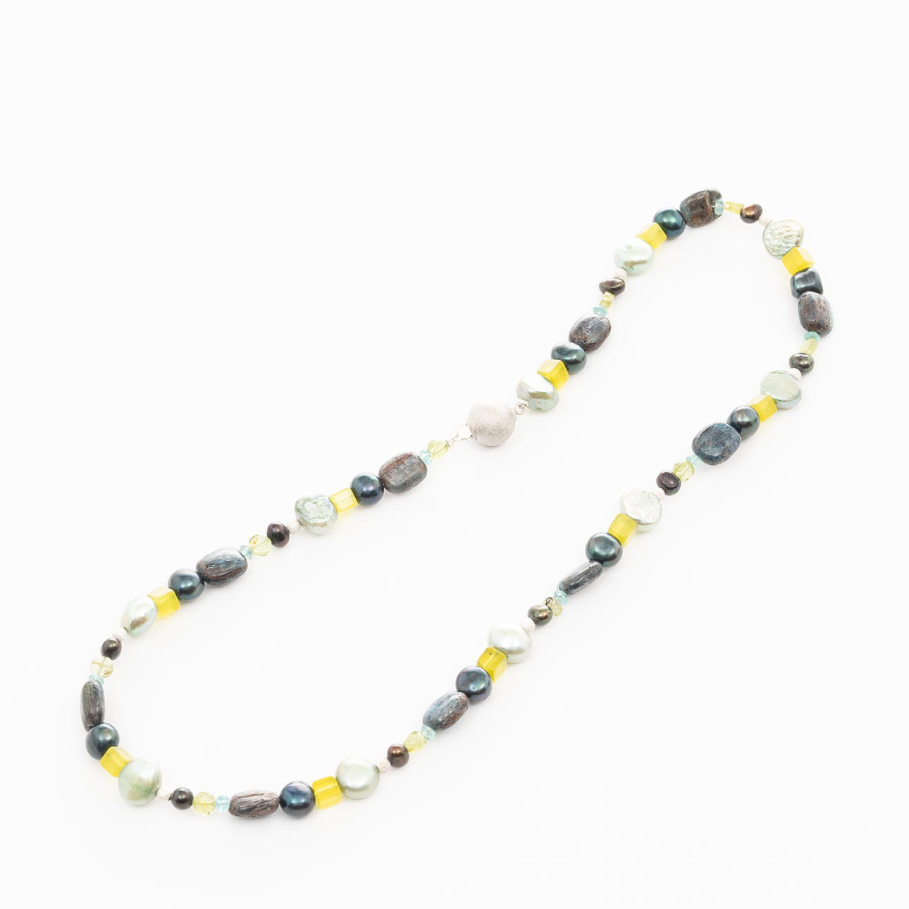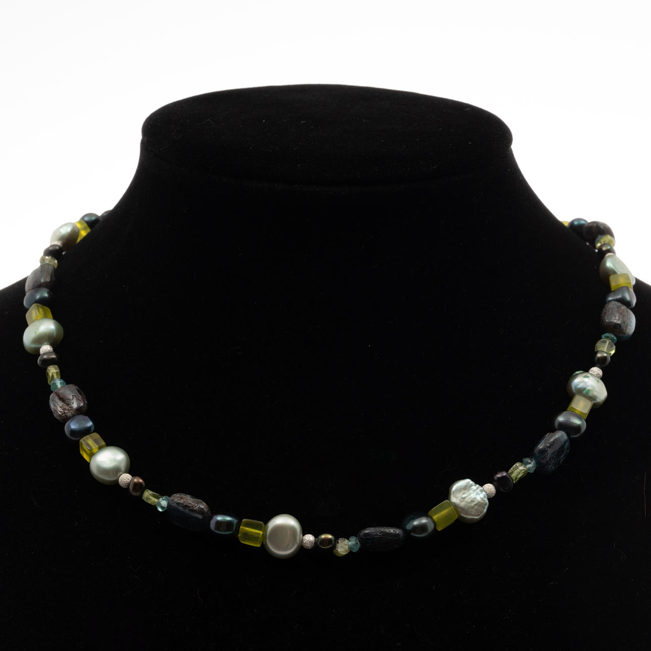 Collier med odlade pärlor, slipade labradorit, peridot, akvamarin och citrin Lås och kulor i sterlingsilver Längd 44 cm Stämplad 925.