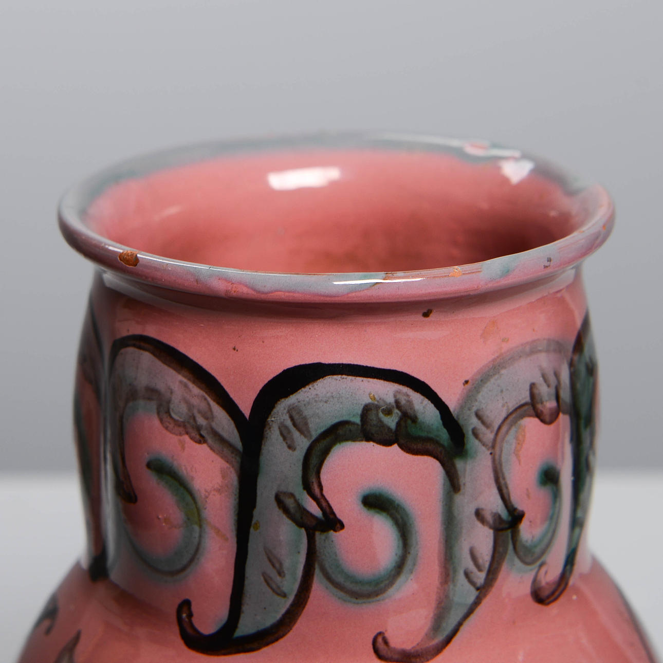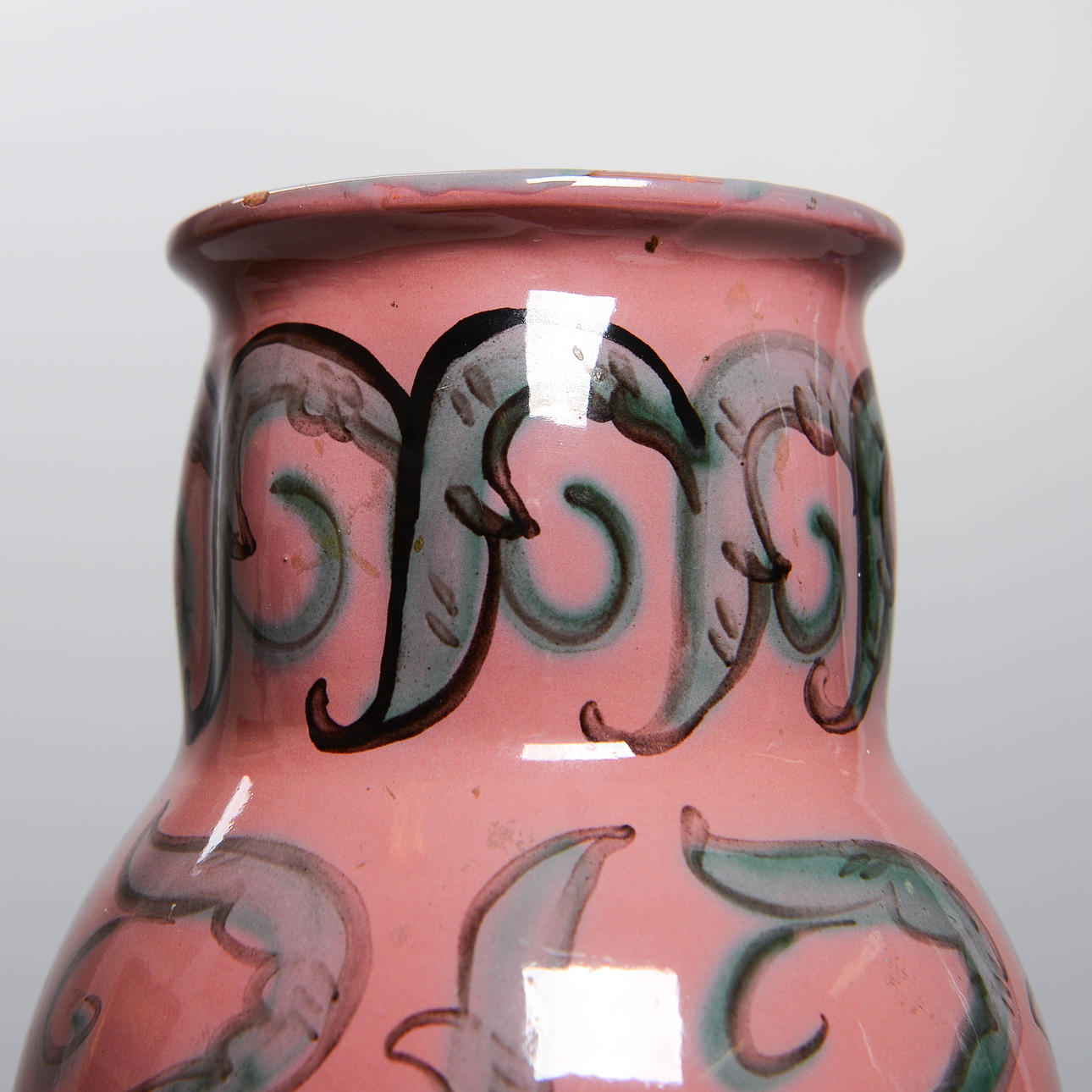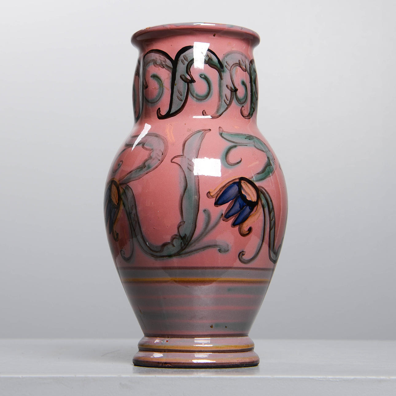 Lergods med handmålad dekor av blommor. Höjd 27 cm.