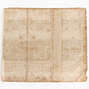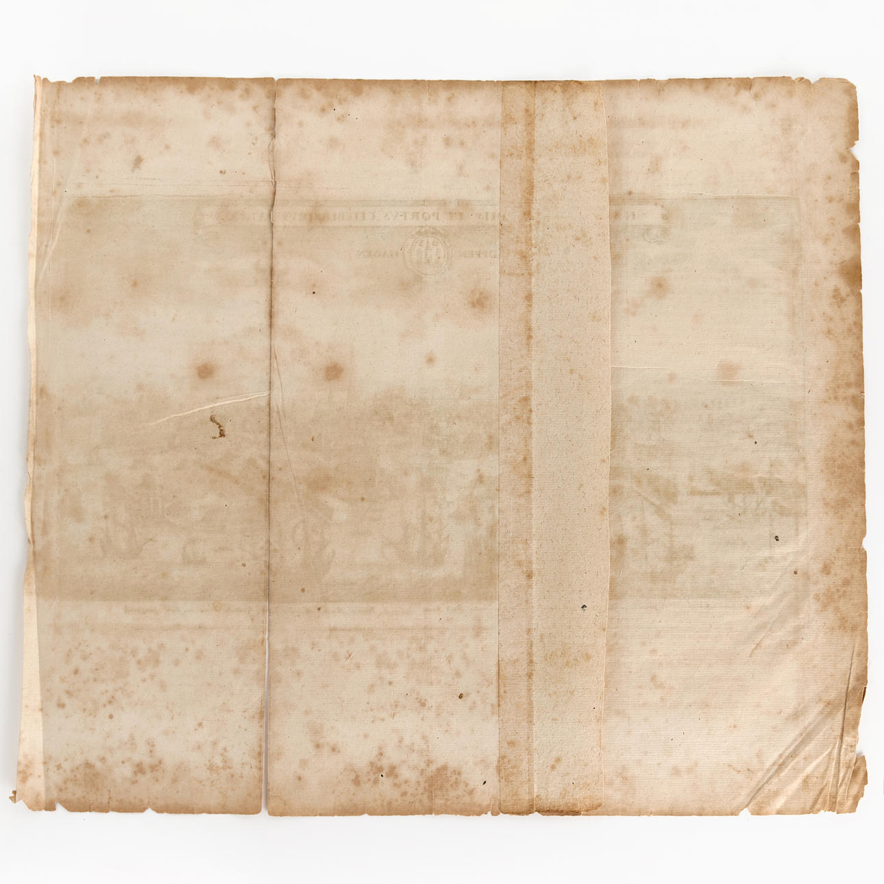 Missfärgad, fläckar. Skador, veck och revor i marginalen. Två vertikala vikveck, varav det högra med nästintill helt genomgående reva.