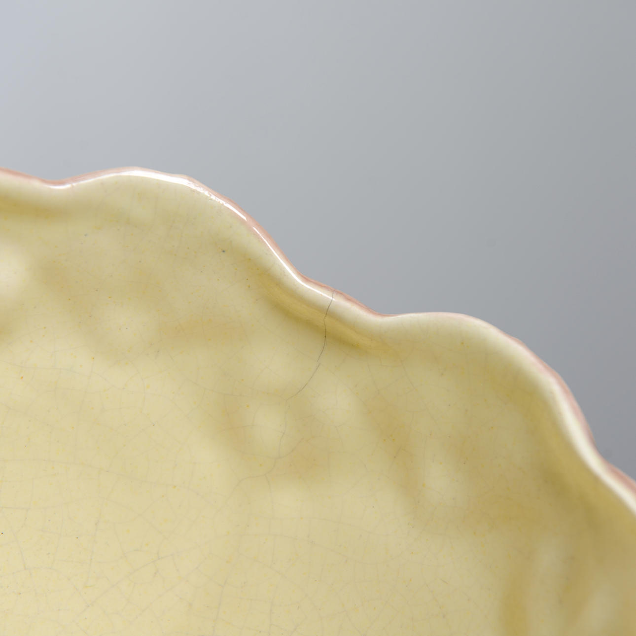 Krackelyr, fläckar på insida, märken. Spricka på ena sidan.