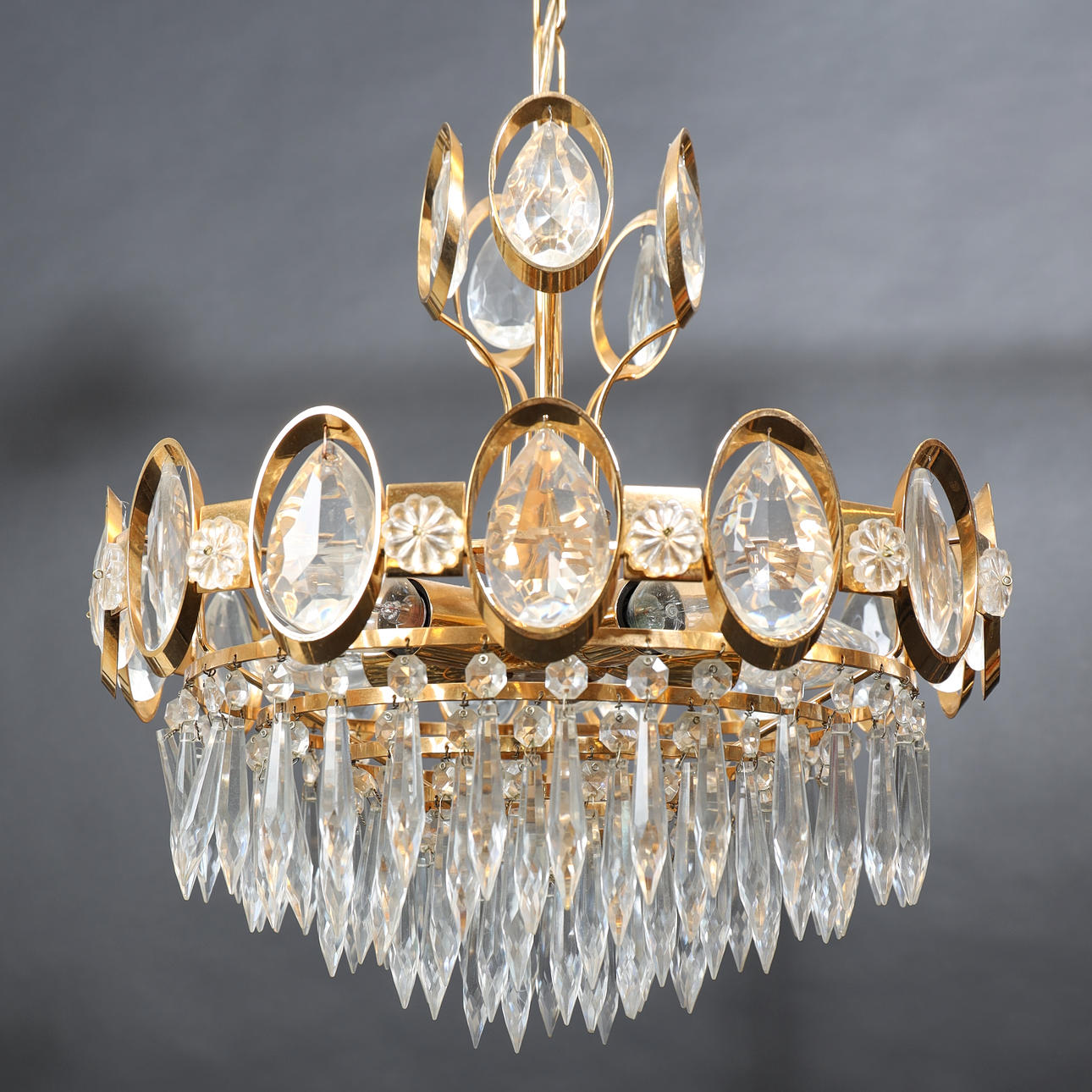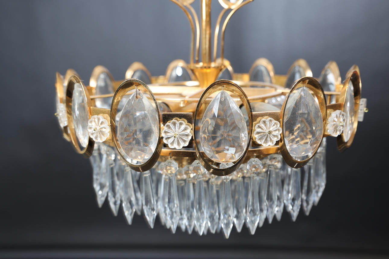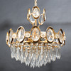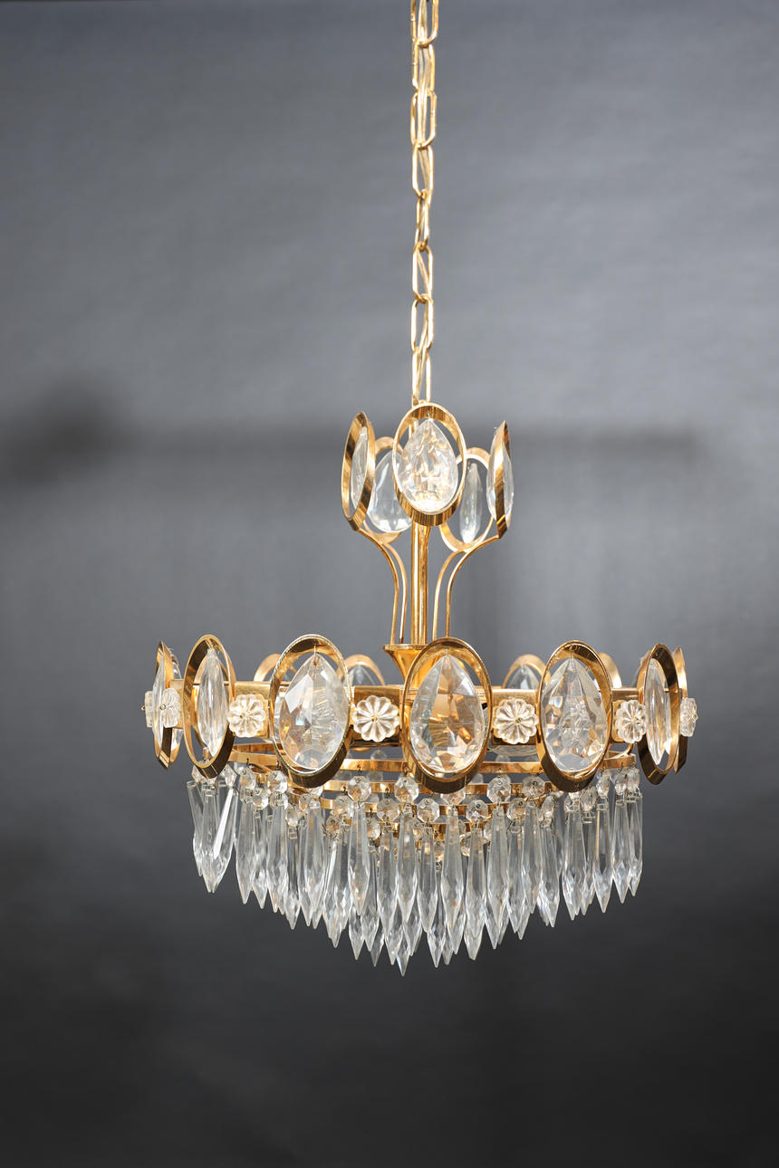 Förgylld metall, behängd med prismor.